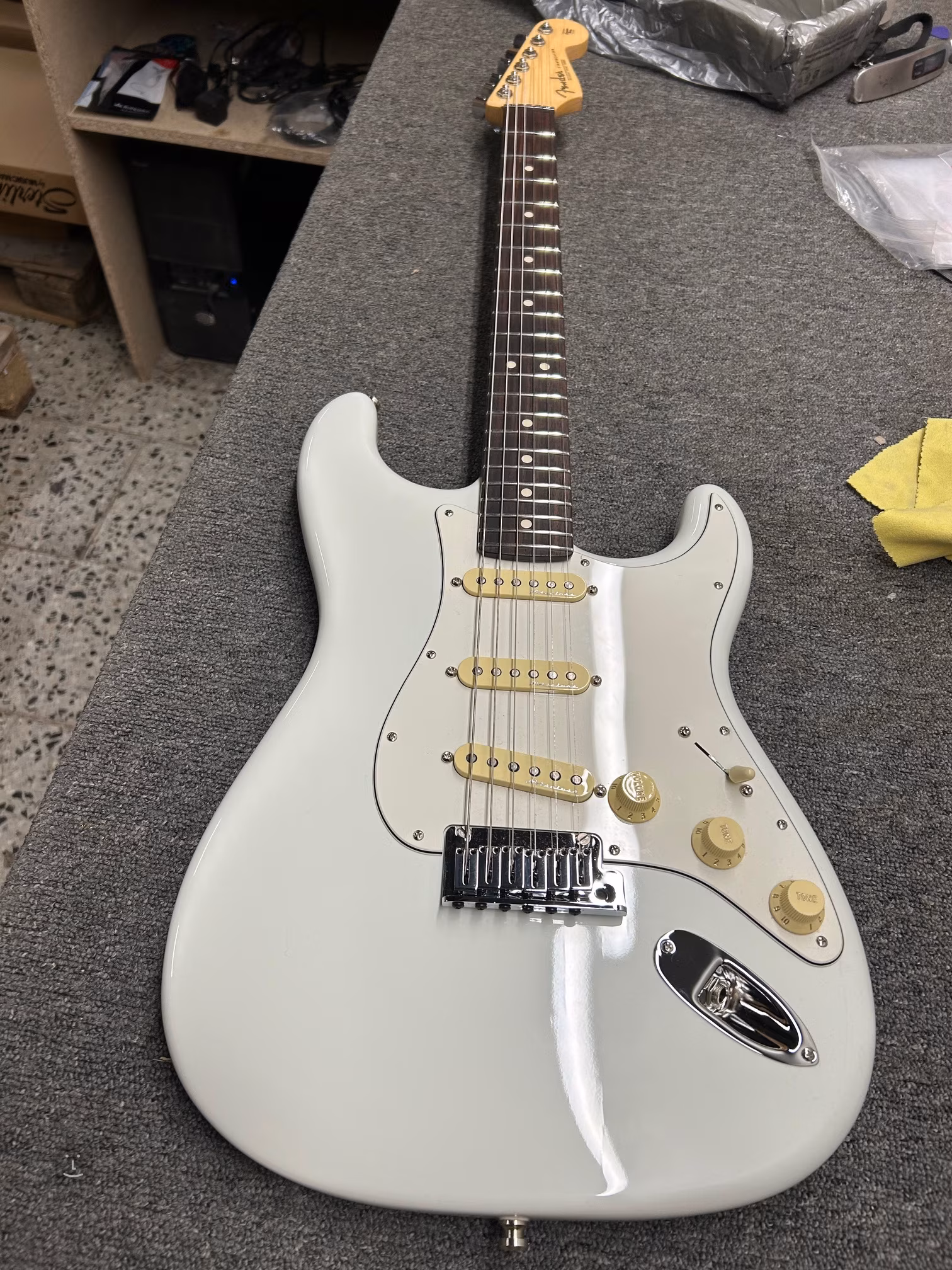 Jeff Beck Signature Stratocaster RW Olympic White je signature model slavného anglického kytaristy, který ovlivnil několik generací muzikantů. Olšové tělo kytary zdobí povrchová úprava NOS (New Old Stock), což je zcela autentický finiš originálů z 50. a 60. let bez prvků umělé patiny a projevů stárnutí v podobě vybledlého laku. K užšímu javorovému krku s pohodlným Thin “C” profilem je přilepen palisandrový hmatník osazený dvaadvaceti pražci velikosti Medium Jumbo.Tvarovaná patka krku usnadňuje dohmat na vyšších polohách hmatníku.