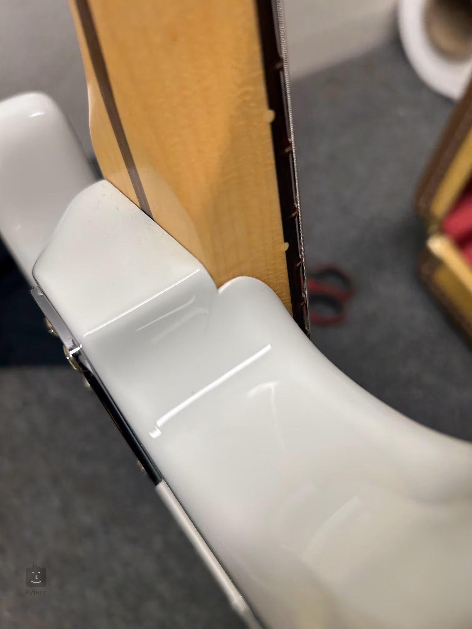 Praskliny v laku u spoje krku s tělem nástroje (viz foto), je to pouze v laku. Odpadlý cvoček na zadní straně kufru (viz foto). Jinak je nástroj v pořádku a plně funkční.