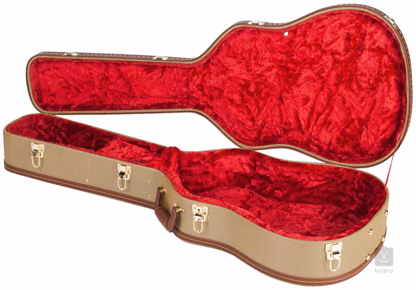 Tento kufr je určen pro akustické kytary Fender typu Dreadnought, nicméně lze použít i s jinými modely odpovídajících rozměrů, a to jak pro 6strunné tak 12strunné verze. Jeho skořepina je z dřevotřísky s tweedovým potahem, interiér je vystlaný červeným plyšem a hardware je mosazný. Vašemu nástroji nabídne maximální ochranu za všech okolností. Zabudovány jsou prostory pro uložení příslušenství.