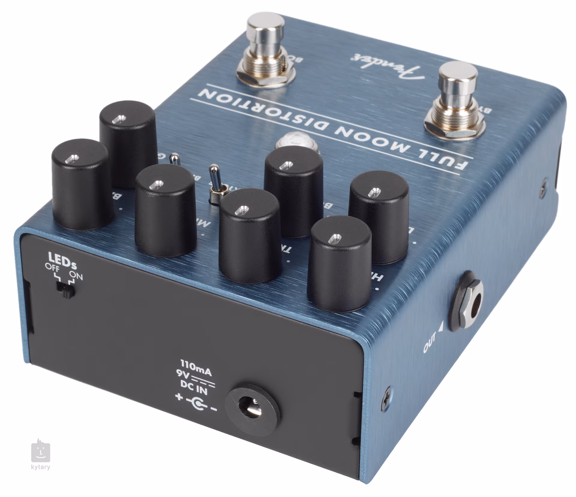 Full Moon Distortion je praktický hi-gain distortion pedál od značky Fender s širokými možnostmi nastavení, který cíleně míří na kytaristy s oblibou v řádně hlasitém zvuku (od metalu, metal/core, HC až po grind core). Díky funkci Boost s příslušným footswitchem a zesílení až o 12 decibelů se zcela obejdete bez dalších přepínačů pro zesílení kytarových sól a vyhrávek. Tradiční ovladače v podobě nastavení hlasitosti (Level), zkreslení (Gain) a třípásmového ekvalizéru (Treble, Middle, Bass) doplňuje potenciometr Hi-Treb pracující jako low-pass filtr a dva přepínače Texture a Bite. Prvním volíte mezi symetrickým/nesymetrickým klipováním, Bite nakopává vyšší středové frekvence, takže se váš zvuk lépe prosadí v mixu.