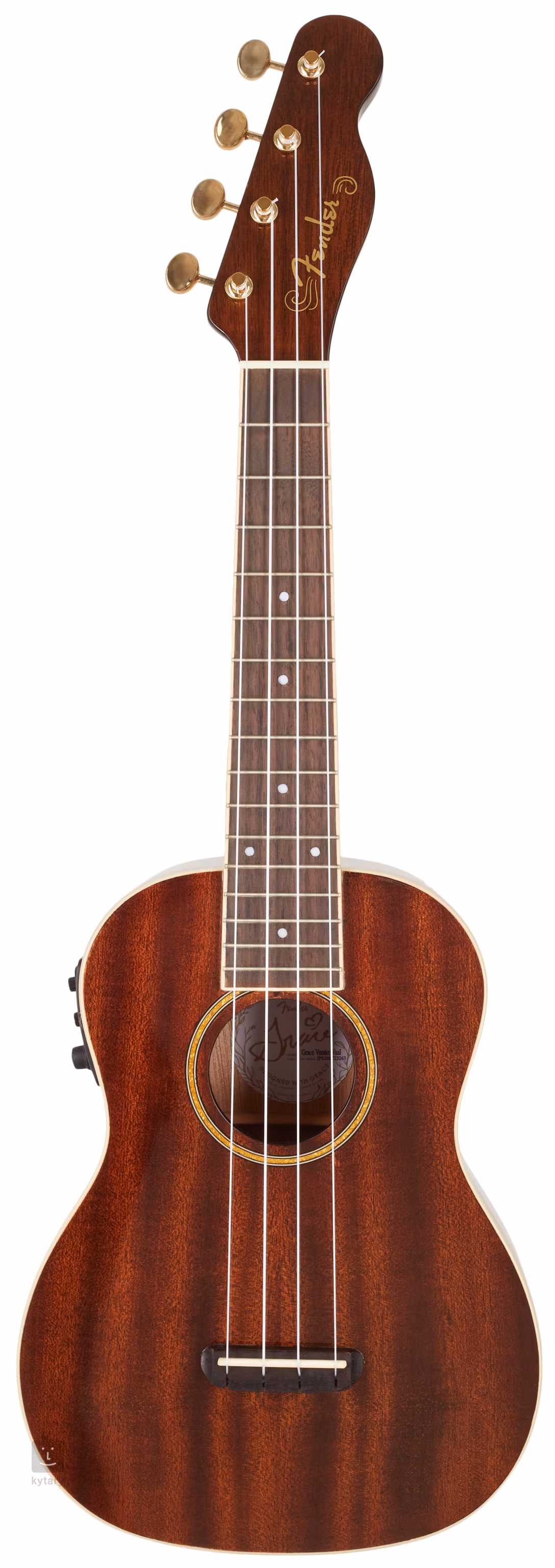 O ozvučení nástroje se stará preamp Fishman Kula s ovladači Volume, Phase, třípásmovým ekvalizérem a integrovanou ladičkou. Lesklý finiš v barvě Dark Walnut, zlatá rozeta a hardware, dekorace ozvučnicového otvoru inspirovaná výtvarnými motivy z první desky Grace VanderWaal Just the Beginning a signatura se srdíčkem na zadní části hlavice dodávají tomuto ukulele punc opravdové výjimečnosti.