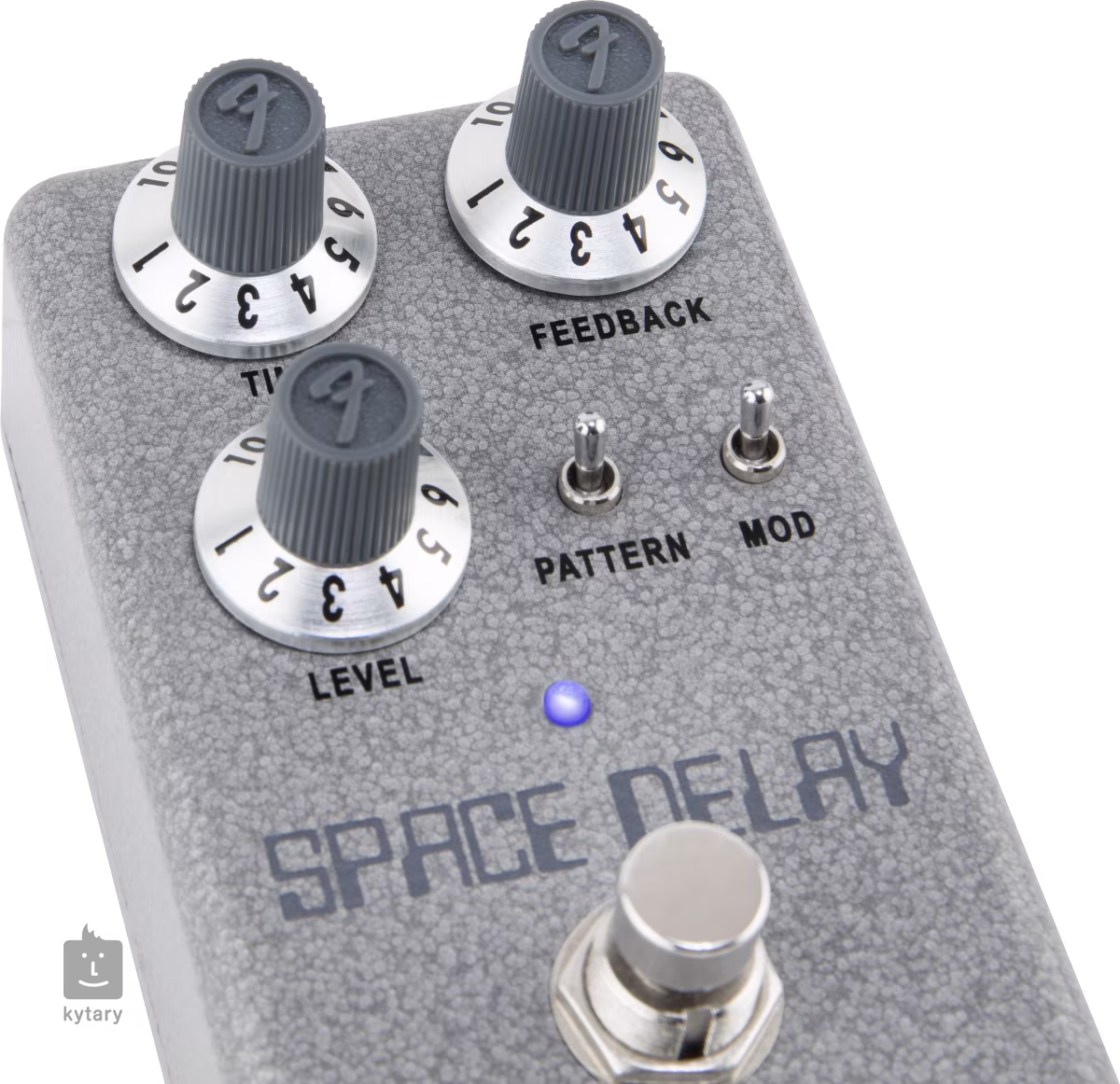 Hammertone Space Delay je kompaktní kytarový efekt značky Fender s přímočarým designem a přes menší rozměr poměrně slušnými možnostmi zvukových nastavení efektu delay. Krabička nabízí vřelý zvuk páskového echa s možností volby tří odlišných rytmických patternů frázování efektu (switch Pattern), delay time až 950 ms, volitelnou modulaci delay efektu (switch Mod) a standardní ovladače délky, počtu opakování a mixu dry/wet signálu. Rychlost a intenzitu přidané modulace upravíte pomocí interních trimmerů. Hammertone Space Delay tak dokáže vykouzlit širokou škálu působivých zvukových ploch od střídmějších ozvěn s čistým zvukem po sonické vlny s nekonečnou oscilací.