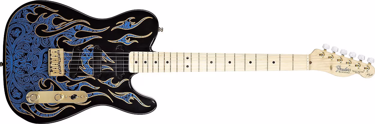 Struny jsou uchyceny přes nultý pražec z umělé kosti v pozlacených mechanikách Deluxe Cast/Sealed s perleťovými kolíky a v pevné pozlacené kobylce se šesti sedly s ukotvením strun skrze tělo nástroje. Stylový vzhled kytary podtrhuje design těla v provedení Blue Paisley Flames a firemní logo se signaturou na hlavici kytary.