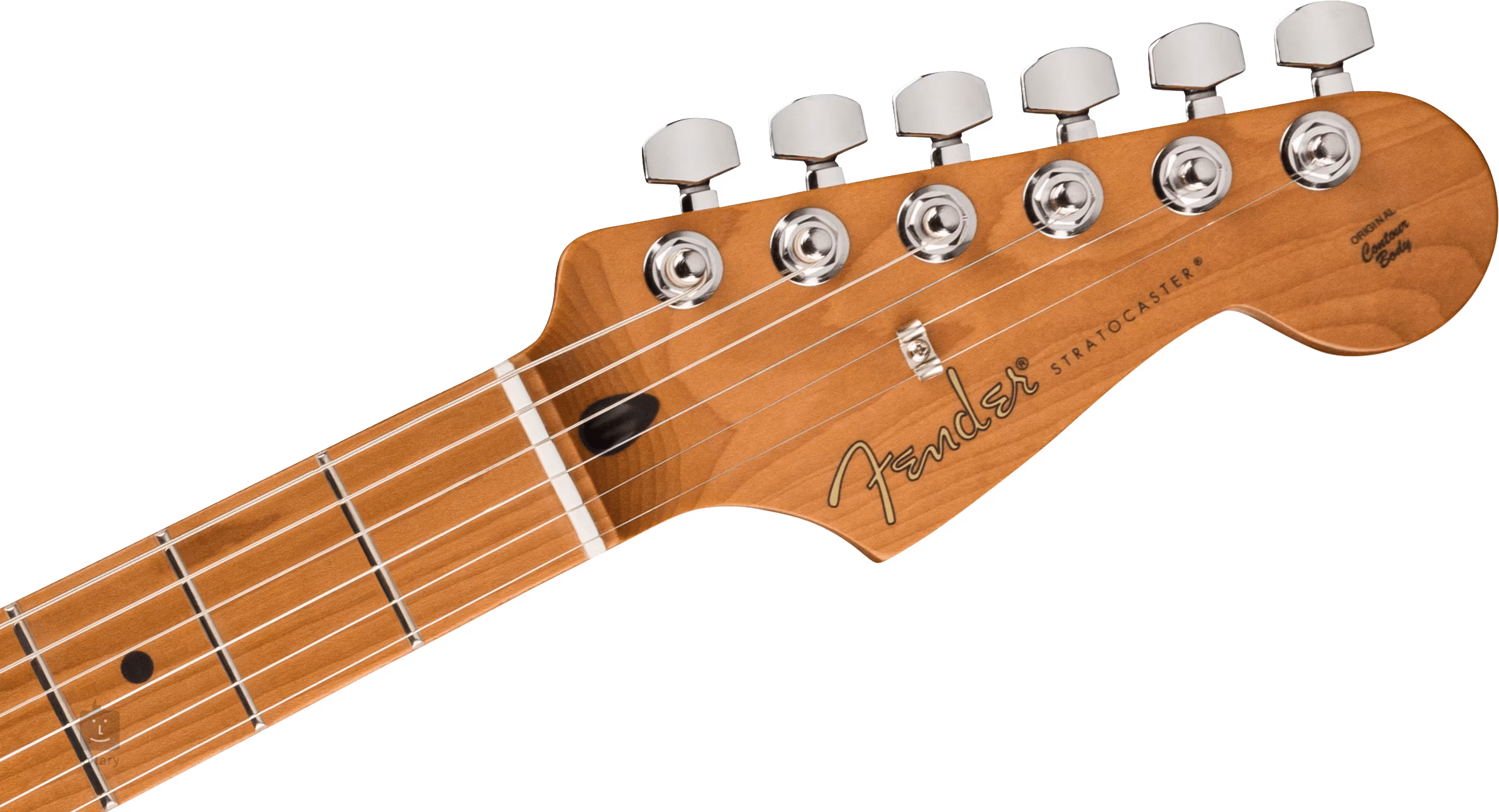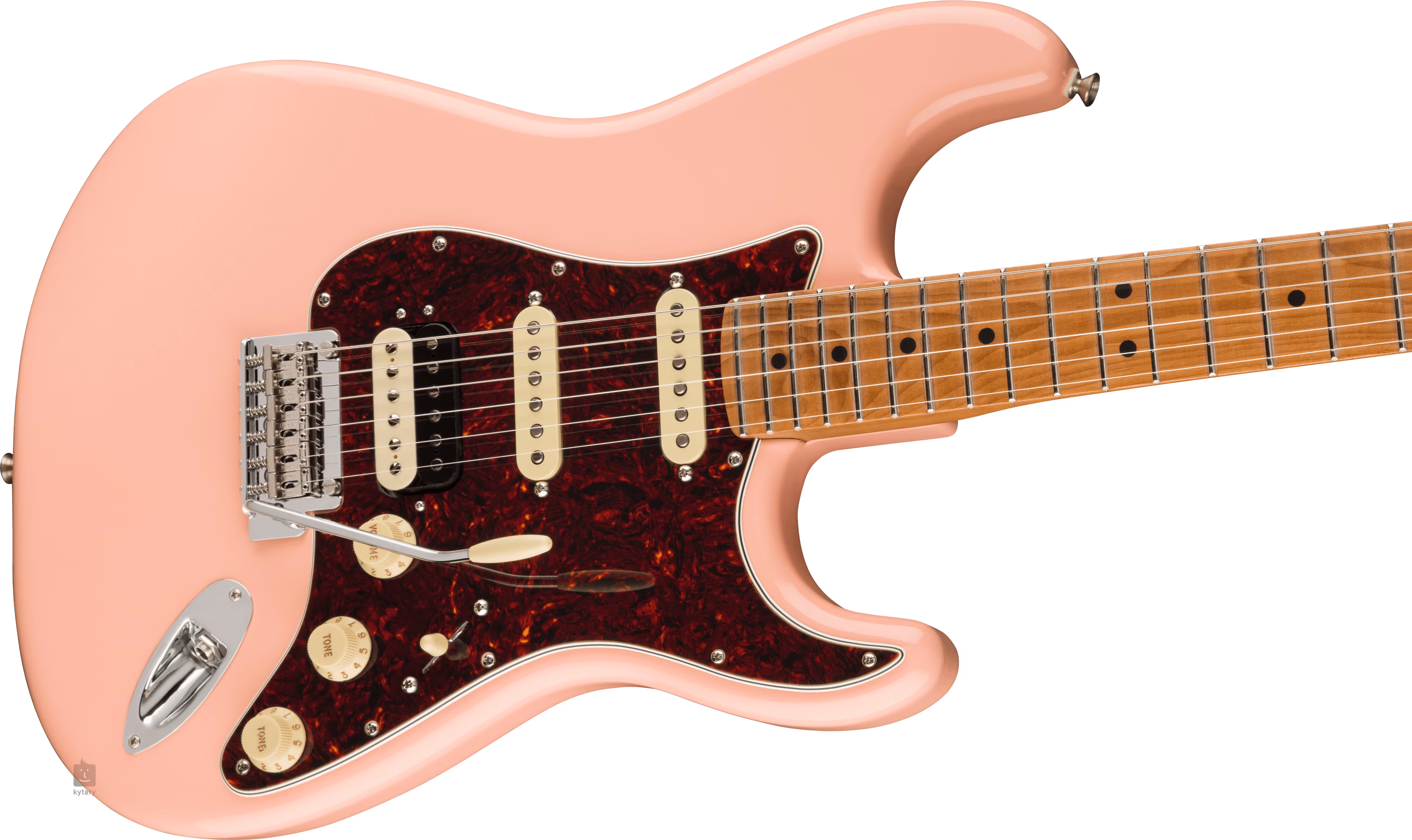 Player Stratocaster HSS Shell Pink je model z limitované edice značky. Olšové tělo kytary kryje lesklý polyesterový lak. Krk má příjemný profil “Modern C”, plochu hmatníku z “pečeného” javoru (roasted maple) rozděluje dvaadvacet pražců velikosti Medium Jumbo a tradiční poziční tečky.