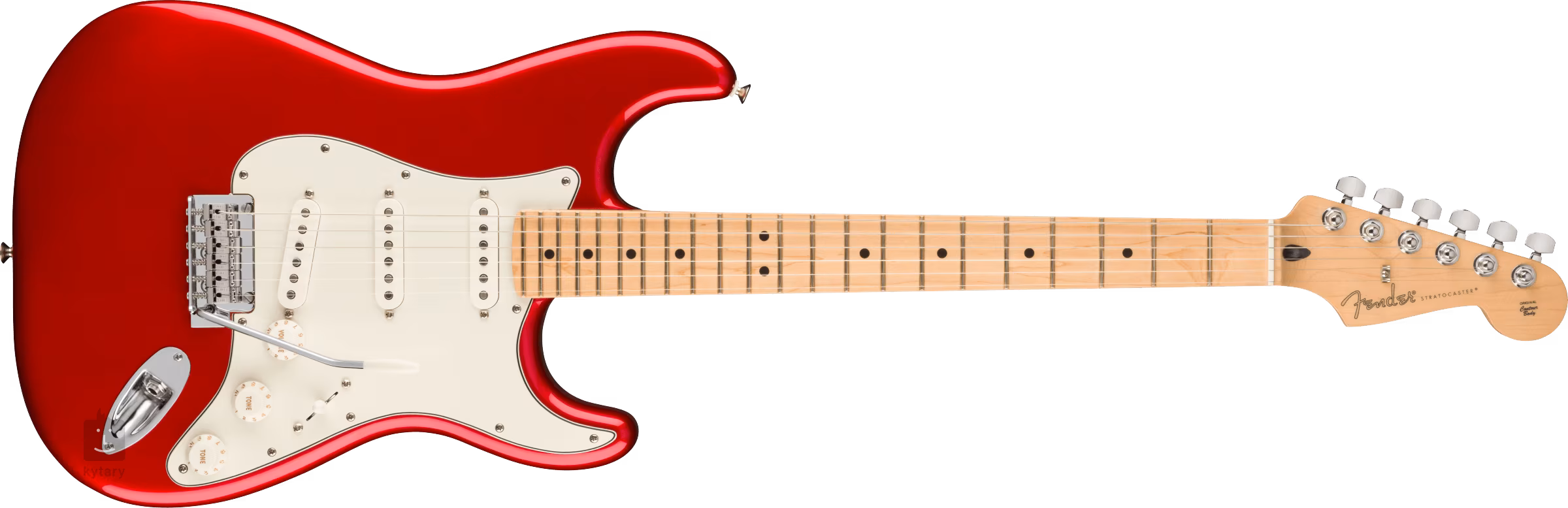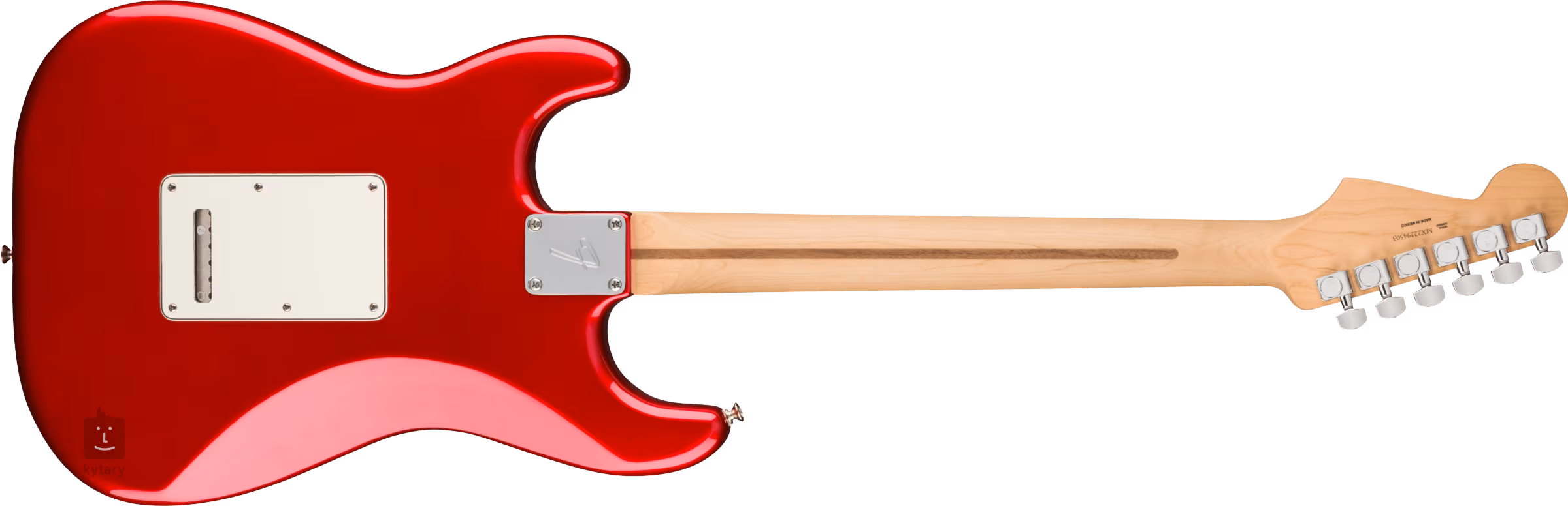 Olšové tělo Stratocasteru PLAYER STRAT MN CAR kryje lesklý polyesterový lak. Krk s “Modern C” profilem a hmatník kytary jsou zhotoveny z javoru, plochu hmatníku rozděluje dvaadvacet pražců velikosti Medium Jumbo a černé poziční tečky.
