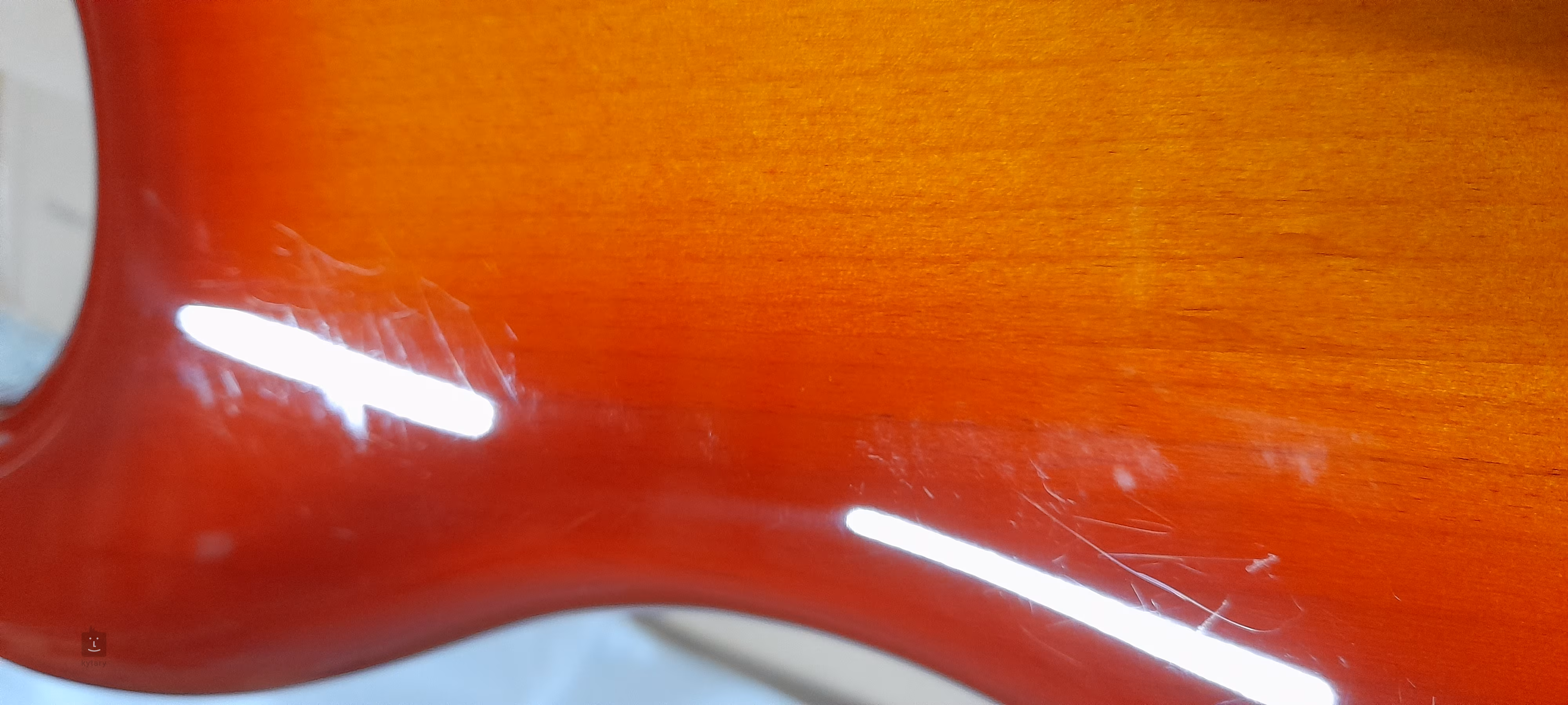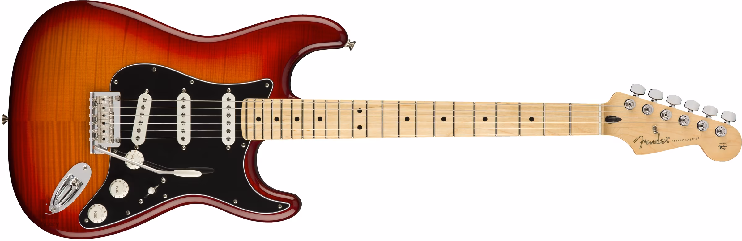 Olšové tělo tohoto Stratocasteru zdobí top z fládrovaného javoru a lesklý polyesterový lak. Plochu javorového hmatníku rozděluje dvaadvacet pražců velikosti Medium Jumbo a poziční značky.