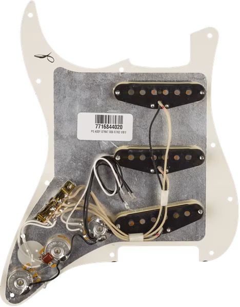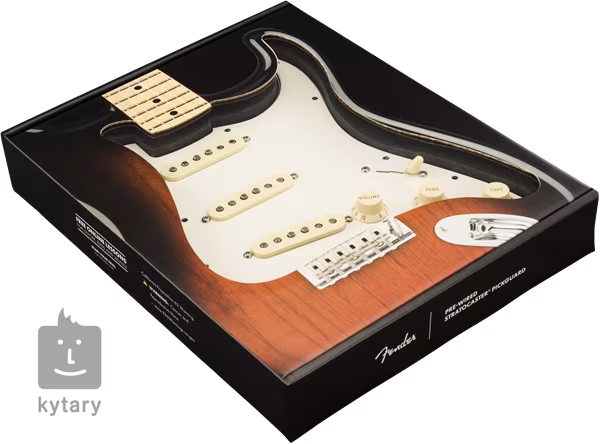 Pickguardy Pre-Wired Strat značky Fender představují rychlé a bezbolestné řešení výměny vašeho starého pickguardu a snímačů. Konkrétně Strat SSS 57/62 WBW nabízí bílý pickguard osazený single-coil snímači Fender Original 57/62, přepínačem snímačů, potenciometry (1x Volume, 2x Tone) a kompletně hotovou elektriku. Na vás toho tak moc nezbývá – odstranit starý pickguard, připájet výstupní jack, vyřešit uzemnění, přišroubovat nový pickguard a vyrazit do světa vyzbrojeni autentickým Fender zvukem.