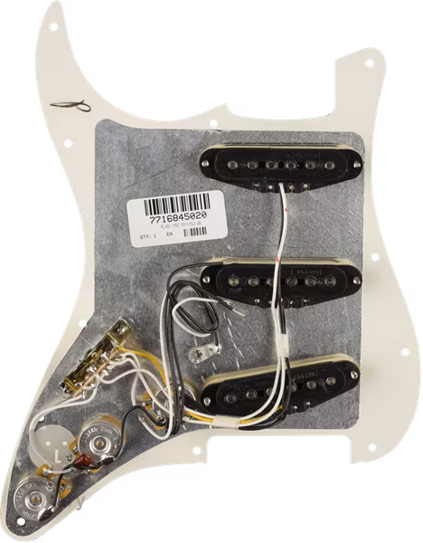 Pickguardy Pre-Wired Strat značky Fender představují rychlé a bezbolestné řešení výměny vašeho starého pickguardu a snímačů. Konkrétně Strat SSS H NSLS WBW nabízí bílý pickguard osazený třemi single-coil snímači Fender Hot Noiseless, přepínačem snímačů, potenciometry (1x Volume, 2x Tone) a kompletně hotovou elektriku. Na vás toho tak moc nezbývá – odstranit starý pickguard, připájet výstupní jack, vyřešit uzemnění, přišroubovat nový pickguard a vyrazit do světa vyzbrojeni autentickým Fender zvukem.