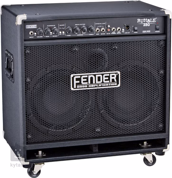 Konkrétně Rumble 350 je 350Wattové tranzistorové kombo osazené dvěma 10palcovými reproduktory Fender Special Design doplněné 2palcovým vypnutelným tweeterem. Jeho ovládací prvky jsou na předním panelu, kde za vstupem pro Vaši baskytaru s -6dB padem naleznete ovladač hlasitosti a 3pásmový semiparametrický ekvalizér sestávající z potenciometrů Bass, Midrange Level, Midrange Frequency a Treble.