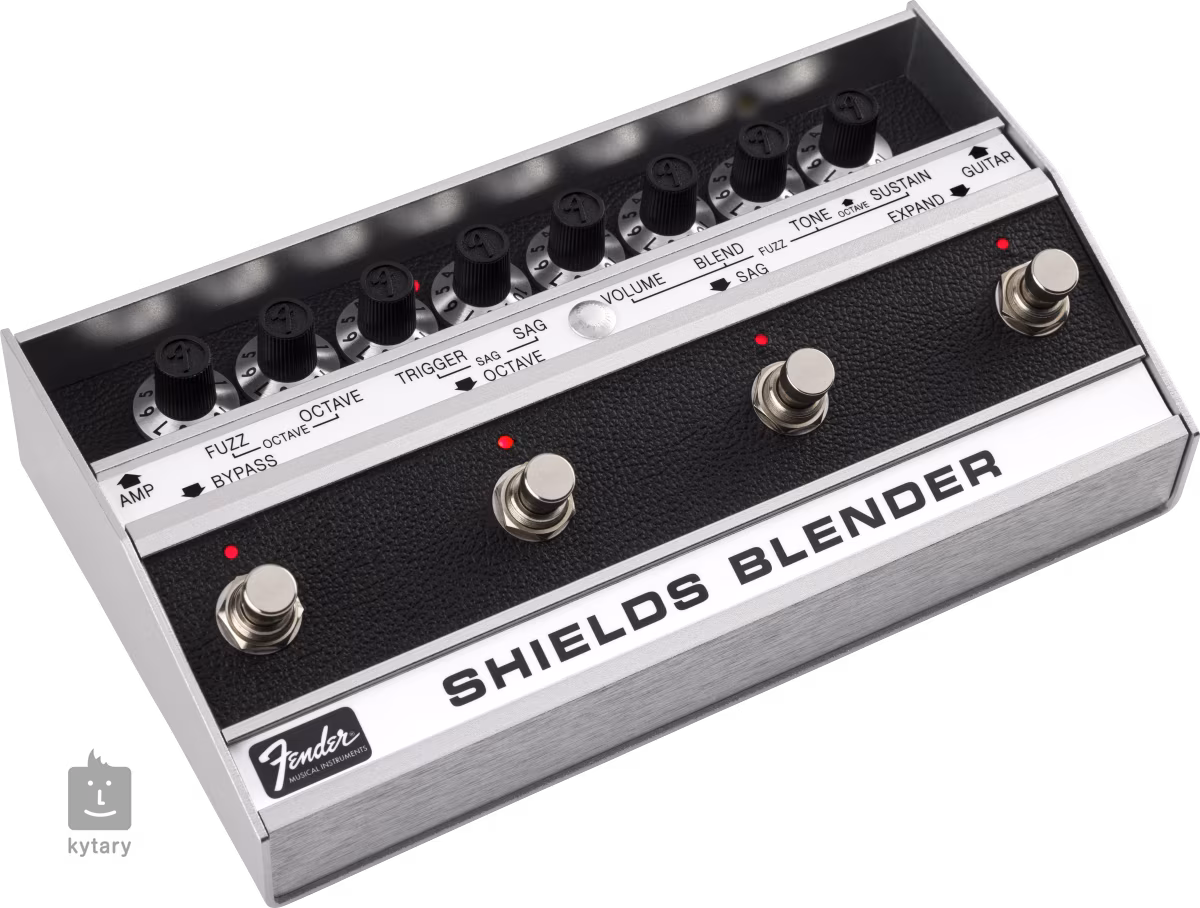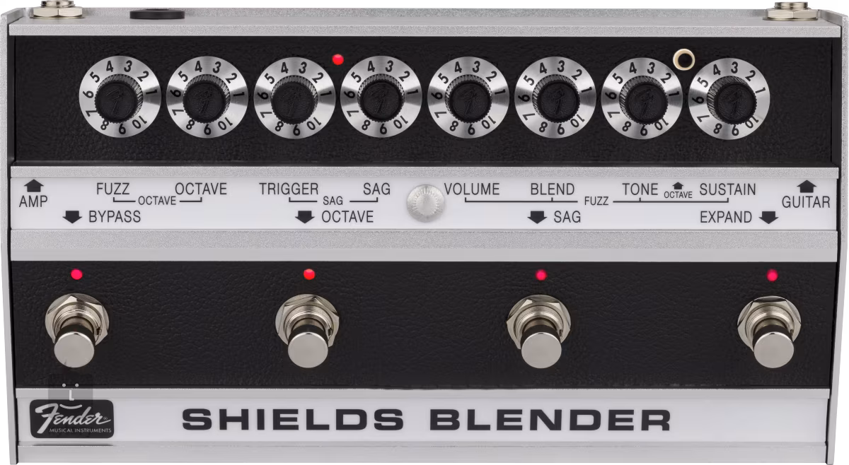 Fender Shields Blender je dvoukanálový fuzz/octave efekt inspirovaný původním Fender Blender obvodem zpěváka a kytaristy kapely My Bloody Valentine Kevina Shieldse. Nabízí dynamicky citlivý Sag/Fuzz obvod ovládaný dynamikou vaší hry a footswitch Octave, kterým volíte mezi dvěma fuzz kanály - první smíchává fuzz efekt s čistým signálem (dry/wet), druhý odstraňuje dry signál a smíchává fuzz s monofonickým suboktávovým fuzzem. Pomocí ovladačů Volume and Blend nastavíte odpovídající poměr čistého a fuzz signálu, knoby Fuzz a Octave poté vytvoříte ideální mix oktávového fuzzu ve dvou nebo třech oktávách.