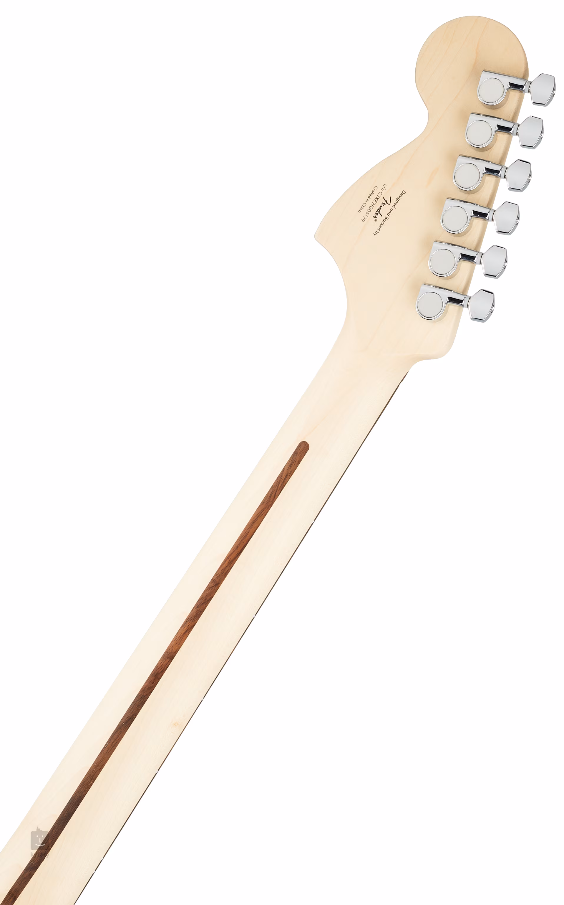 Affinity Series Stratocaster HH nabízí rockerskou úpravu se dvěma humbuckery s keramickými magnety namísto klasické single-coil konfigurace. Lehké topolové tělo nástroje zdobí zvolená barevná úprava a lesklý polyuretanový lak. K přišroubovanému javorovému krku je přilepen hmatník z fíkovníku, který u levnějších modelů standardně nahrazuje palisandr. Plochu hmatníku rozděluje jednadvacet pražců velikosti Medium Jumbo a bílé poziční tečky z imitace perleti. Příjemný užší „C“ profil krku zaručuje komfortní pohyb ruky po hmatníku a dobrý dohmat.