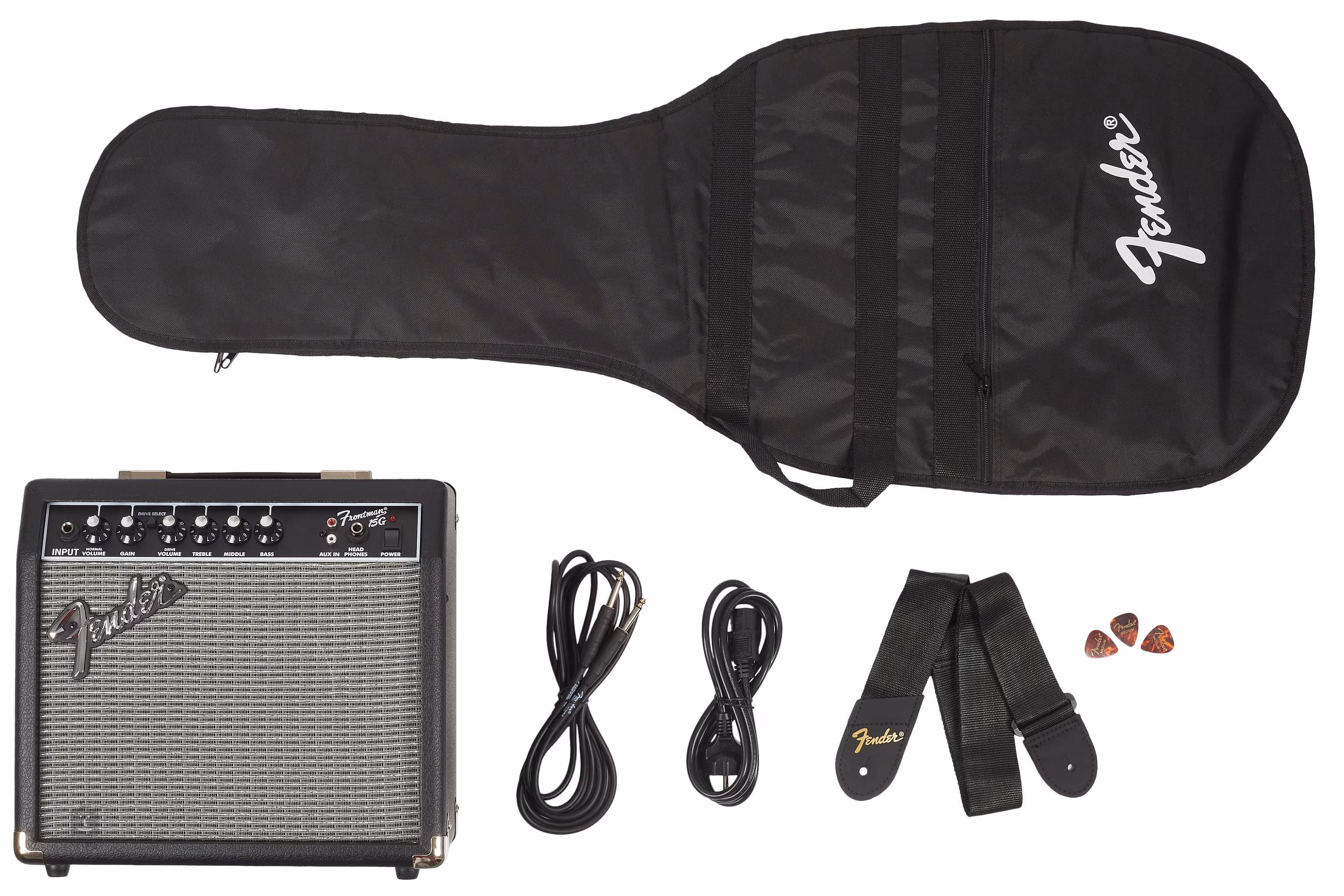 Součástí kompletu je kytarové tranzistorové kombo Fender Frontman 15G s výkonem 15 wattů, dvěma kanály (clean a overdrive), třípásmovým ekvalizérem, sluchátkovým výstupem a Aux In vstupem pro připojení externích multimediálních zařízení, polstrovaný kytarový obal (gig bag), trsátka, kytarový popruh, přibližně tři metry dlouhý nástrojový kabel (výrobce uvádí deset stop) a přístup k online kytarovým lekcím na Fender Play na dobu tří měsíců.