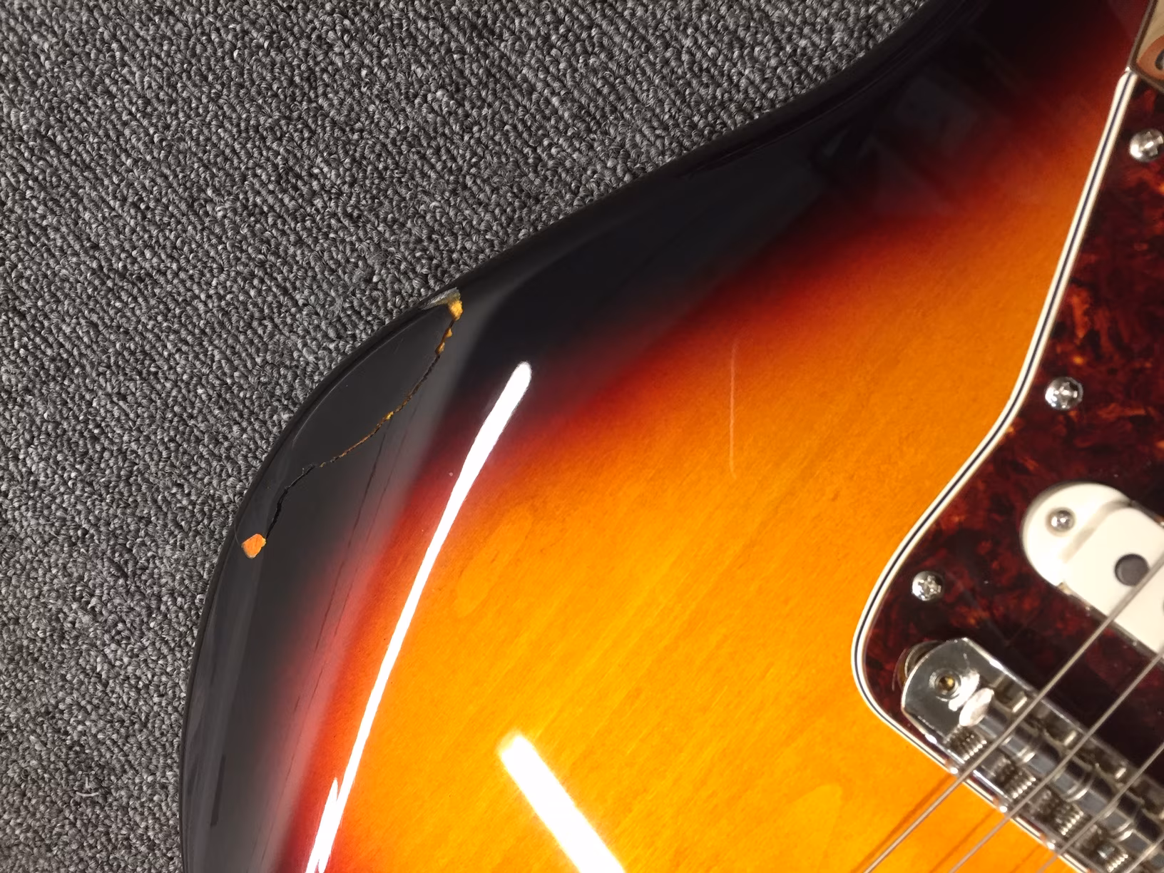 Prasklina v laku na těle kytary nad kobylkou (viz foto). Jinakv pořádku a plně funkční.