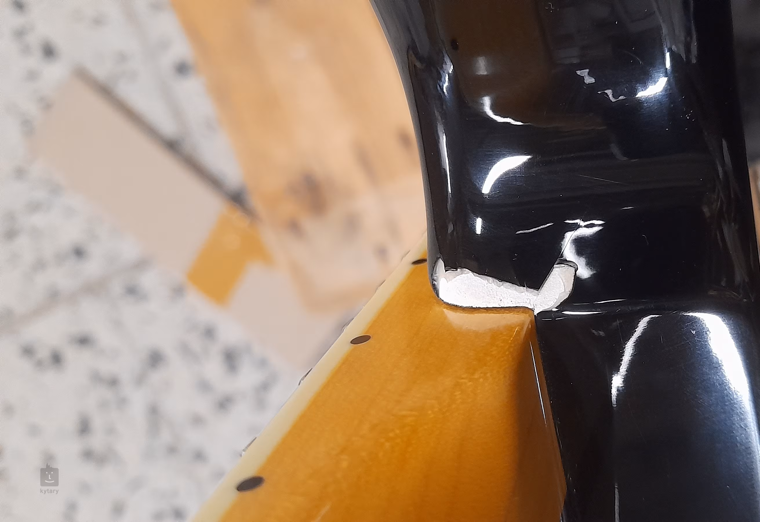 Poškozené zboží - odštípnutý lak na spoji těla a krku (viz foto). Potrhaná, nevzhledná kartonová krabice.