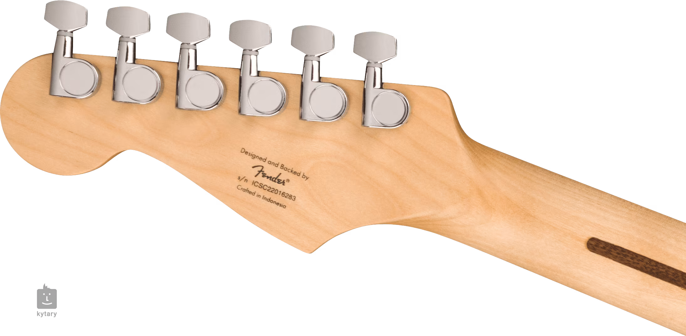 Tři firemní single-coil snímače s keramickými magnety poskytují kytaře čistý zvonivý zvuk s feelem Strat modelů, který se neztratí v řadě hudebních stylů. Jeho kontury upravíte pomocí potenciometrů hlasitosti, dvou tónových clon a pětipolohovým přepínačem snímačů. Struny jsou ukotveny ve firemních die-cast ladicích mechanikách a synchronizovaném tremolu. Stylový Strat design podtrhuje chromovaný hardware, černý jednovrstvý pickguard a firemní logo na hlavici kytary.