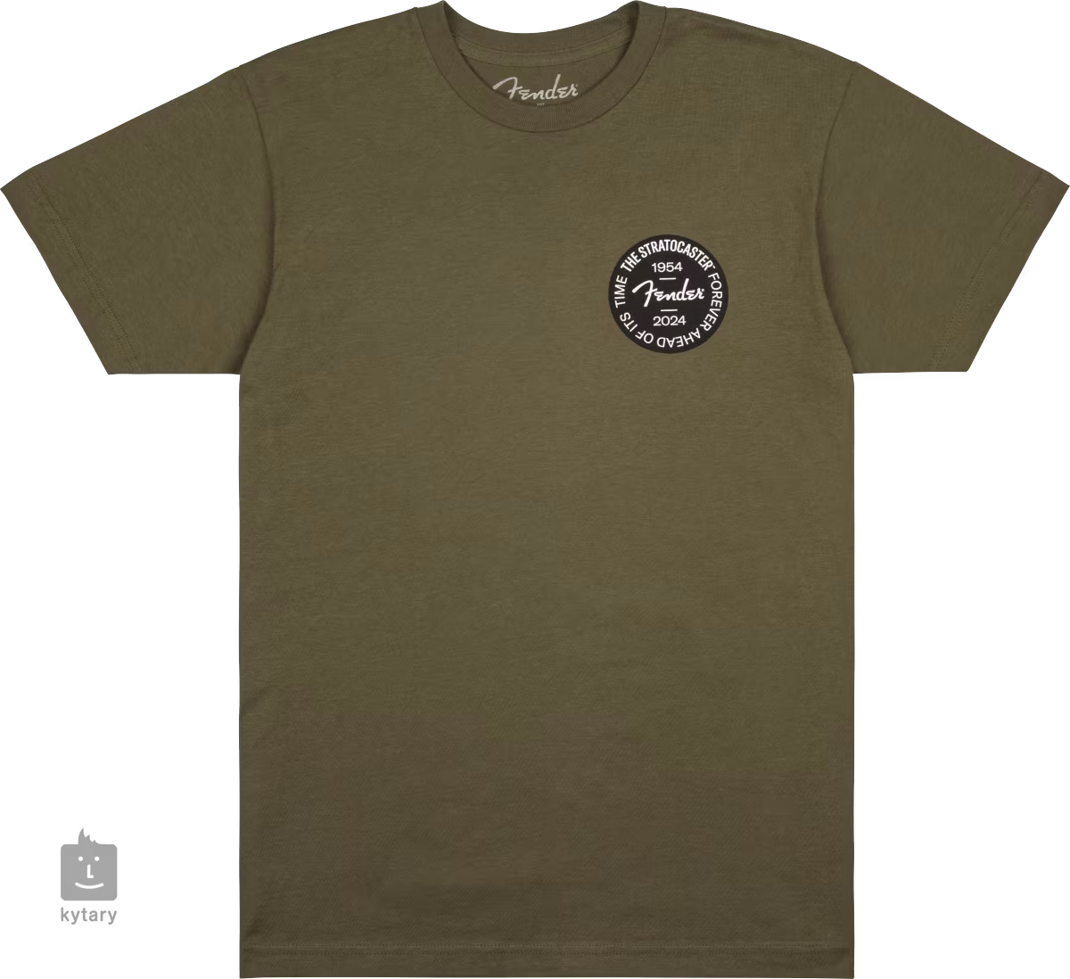 Bavlněné tričko Strat 70th Badge Tee Olive s natištěnou výroční plackou na levé hrudi připomíná sedmdesátiny elektrické kytary Fender Stratocaster. Tričko je k dostání v různých velikostech.