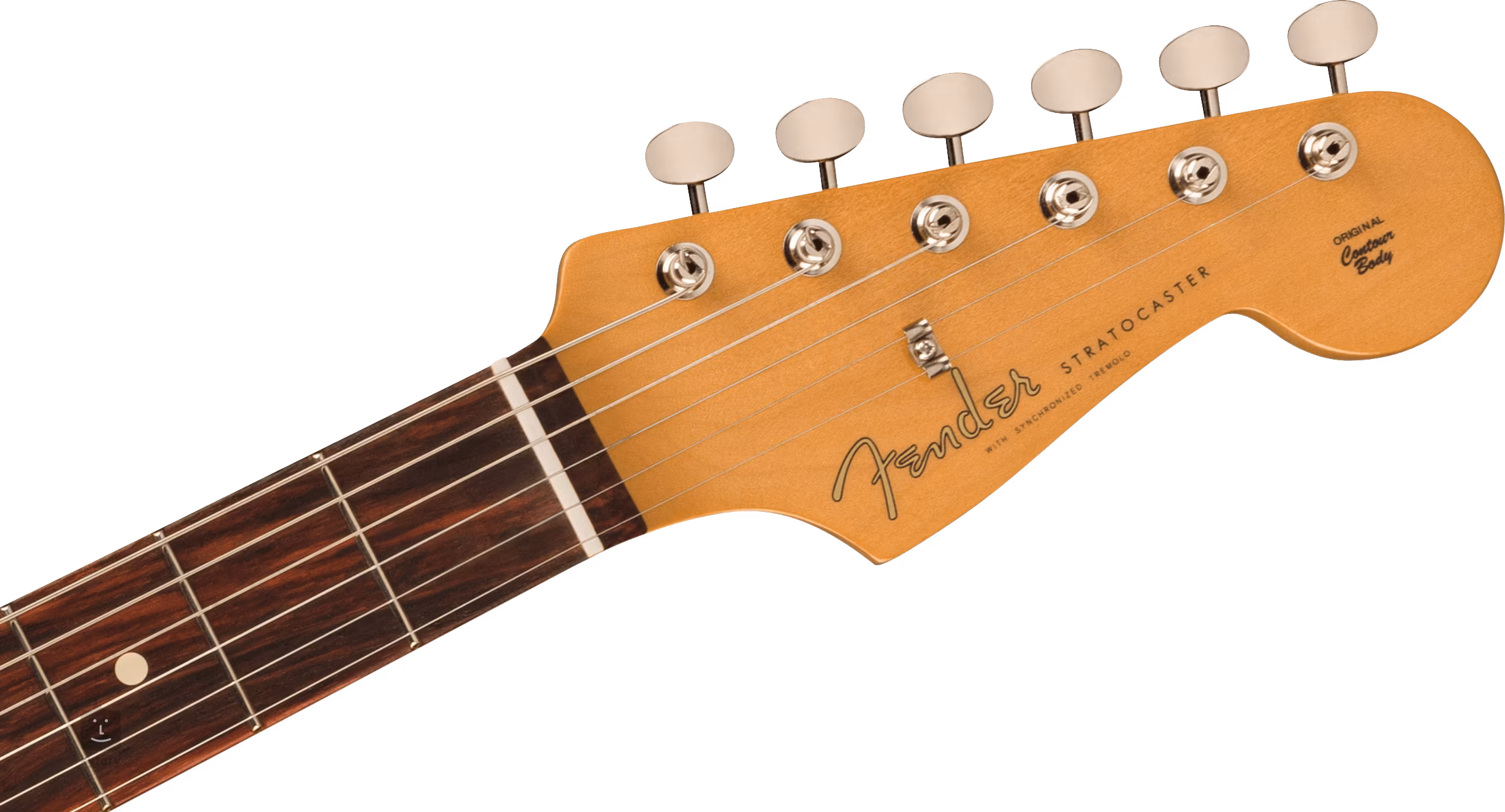 Trio vintage-style 60s snímačů poskytuje kytaře vřelý živý tón s jasně přiznanou Fender DNA. Charakter zvuku upravíte pomocí standardních ovladačů hlasitosti, tónové clony a pětipolohovým přepínačem snímačů. Struny jsou přes nultý pražec ze syntetické kosti uchyceny ve firemních ladicích mechanikách ve vintage stylu a synchronizovaném tremolu s šestibodovým ukotvením. Stylové zpracování podtrhuje třívrstvý pickguard v provedení Mint Green a logo Fender na hlavě kytary.