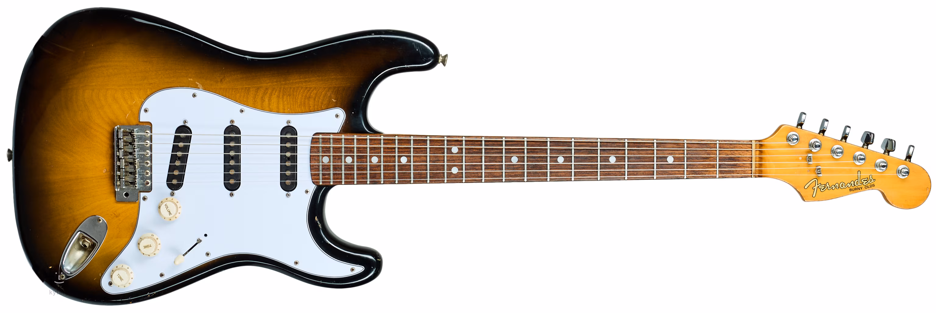 Stratocaster z 2. poloviny 70. let, ještě se "spaghetti" logem, které chrakterizuje toto výrobní období japonské produkce značky Fernandes, pravděpodobně rok výroby 1976.