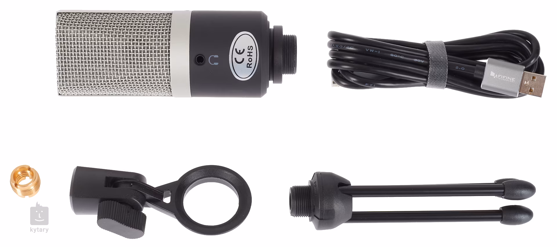 USB kondenzátorový mikrofon disponuje kardioidovou směrovou charakteristikou a je vhodný pro live broadcasting, nahrávání YouTube videí, studiové session, nahrávání podcastů nebo Skype hovory. Mikrofon disponuje vysokou citlivostí a skvělou zvukovou kvalitou, stačí ho tedy pouze připojit do vašeho zařízení a můžete začít nahrávat. Přední panel obsahuje ovladač hlasitosti pro mikrofon, dále zde naleznete sluchátkový výstup pro detailní monitoring v reálném čase. Součástí balení je stolní stojánek, mikrofonní držák, závitová redukce a USB kabel pro připojení do PC nebo laptopu.