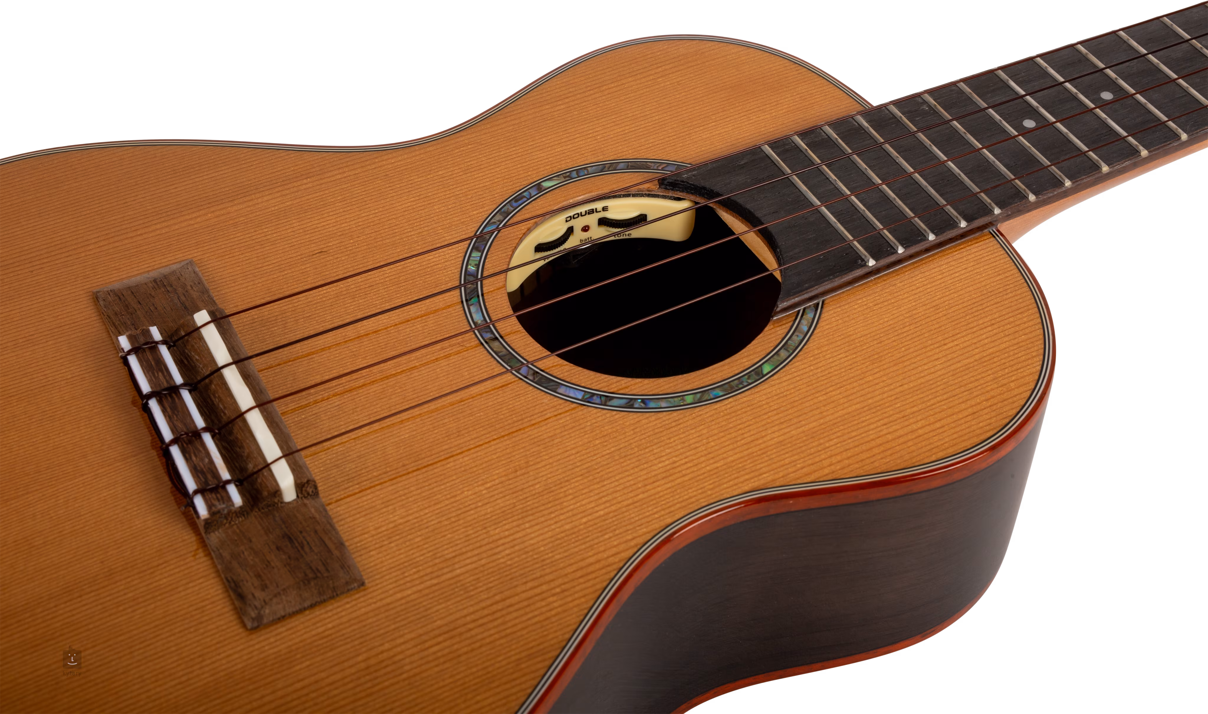 Přední deska koncertního ukulele Diana je zhotovena z masivního cedru, zadní deska a luby z laminovaného mořeného ořechu, jehož kresba pěkně kontrastuje s cedrovým topem. Ke krku z okoumé je přilepen hmatník ze dřeva purpleheart osazený osmnácti pražci. Struny jsou přes sedlo a nultý pražec z kosti uchyceny v hlavici v klasickém designu (slotted headstock). Pěkné zpracování podtrhuje lesklý lak těla, oboustranná obvodová lemovka, perleťová rozeta a hardware ve zlatém provedení.