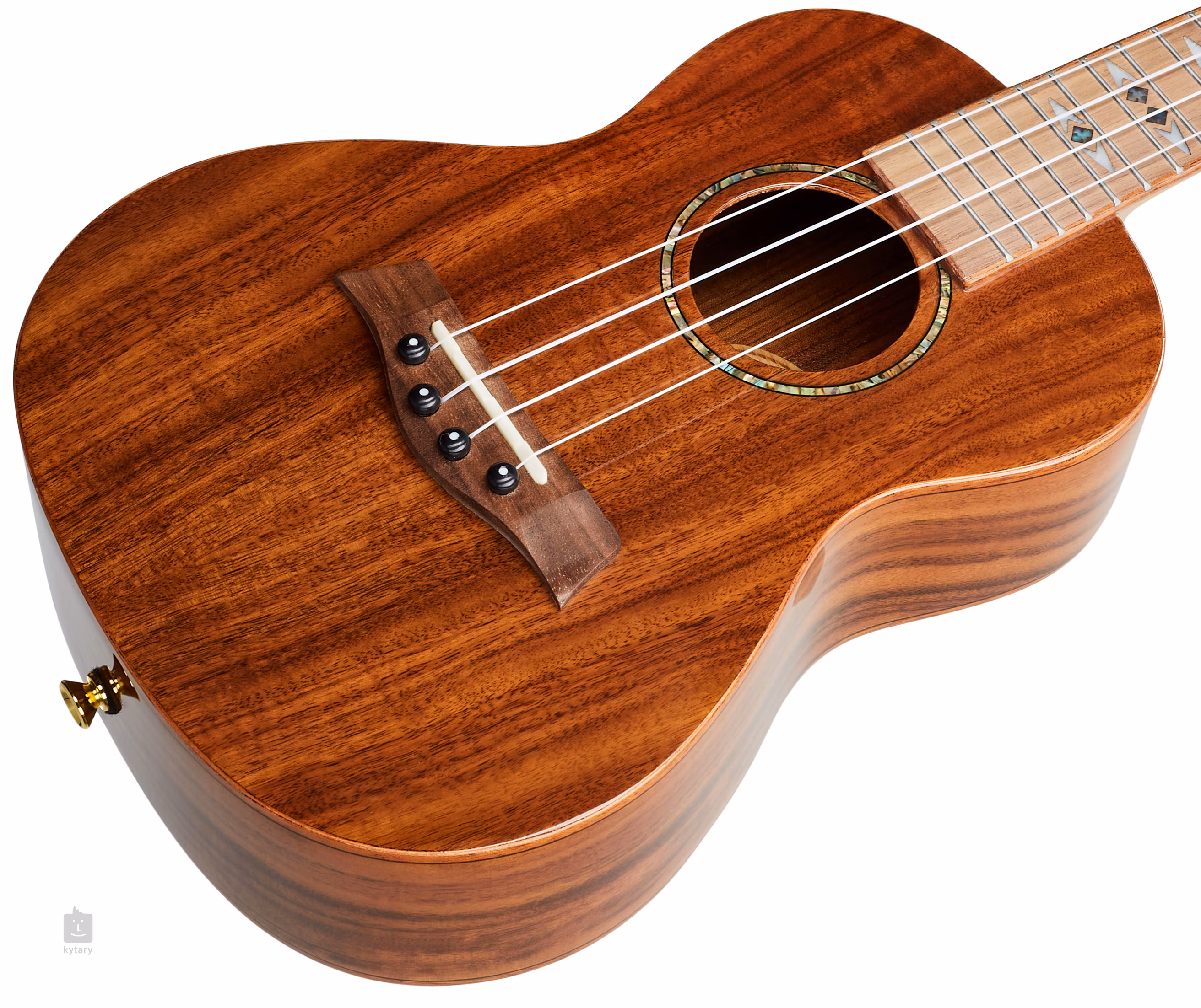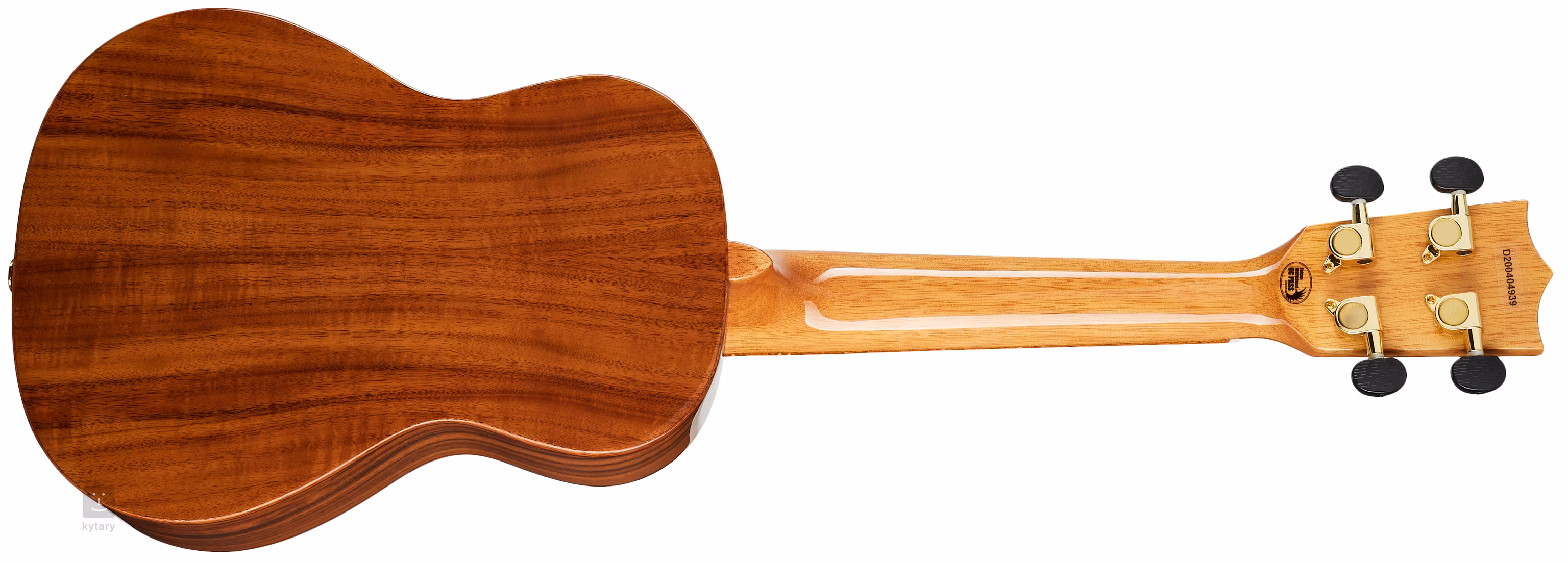 Tělo tohoto koncertního ukulele je zhotoveno z laminované akácie, což je dřevo ze stejné rodiny jako koa. Krk a hmatník nástroje jsou vyrobeny z afrického okoumé a ořechu, což je rovněž poměrně často používaná kombinace dřev. Struny jsou přes nultý a sedlový pražec z kosti ukotveny v ladicích mechanikách kytarového typu (Die-Cast Geared) a ořechové kobylce. Vzhled ukulele zpestřují zmíněné zdobné inlaye na hmatníku a hlavici, hardware ve zlatém provedení a lak rozleštěný do vysokého lesku.