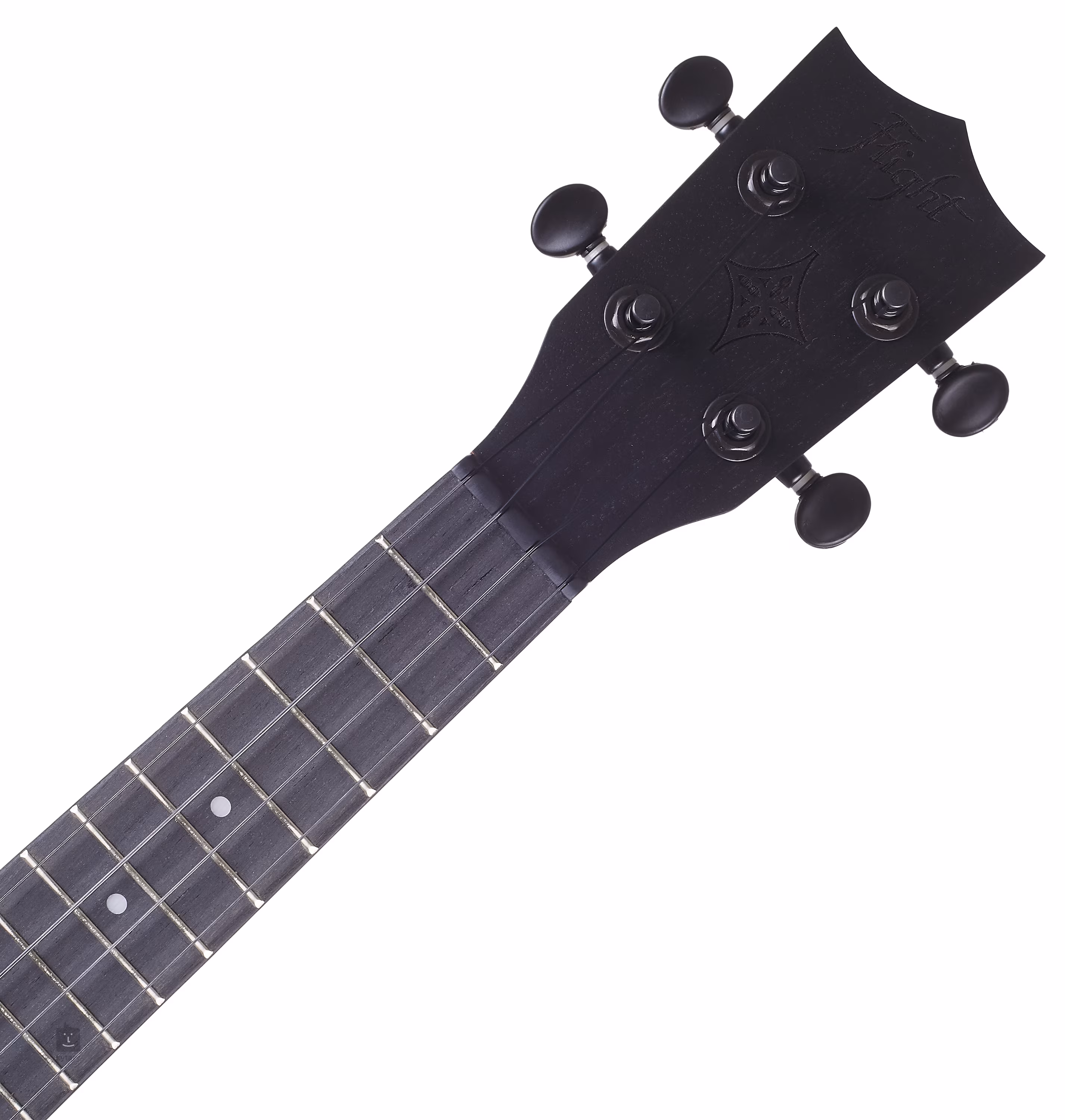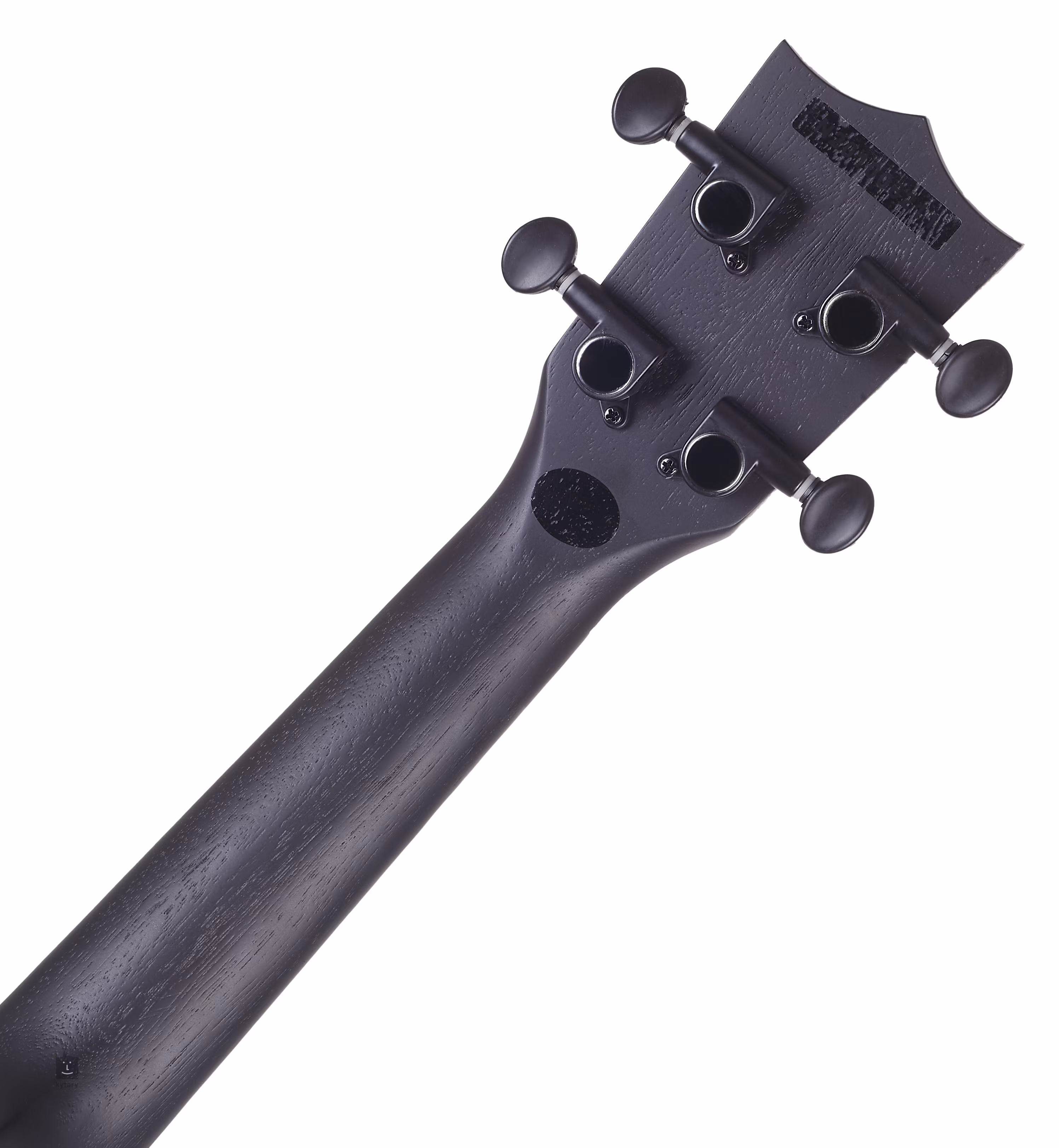 Tělo tohoto sopránového ukulele je zhotoveno z laminovaného sapele, dřeva botanicky příbuzného s mahagonem/pravým mahagonem (proto bývá označováno jako sapele mahogany). Ke krku z afrického okoumé je přilepen hmatník z kompozitního dřeva, což je moderní ekologicky šetrný materiál, který se již roky používá pro tyto účely. Struny jsou přes plastový nultý a sedlový pražec ukotveny v ladicích mechanikách kytarového typu (Geared) a ořechové kobylce. Stylově temný design podtrhuje černý hardware a rozeta v podobě laserové rytiny.