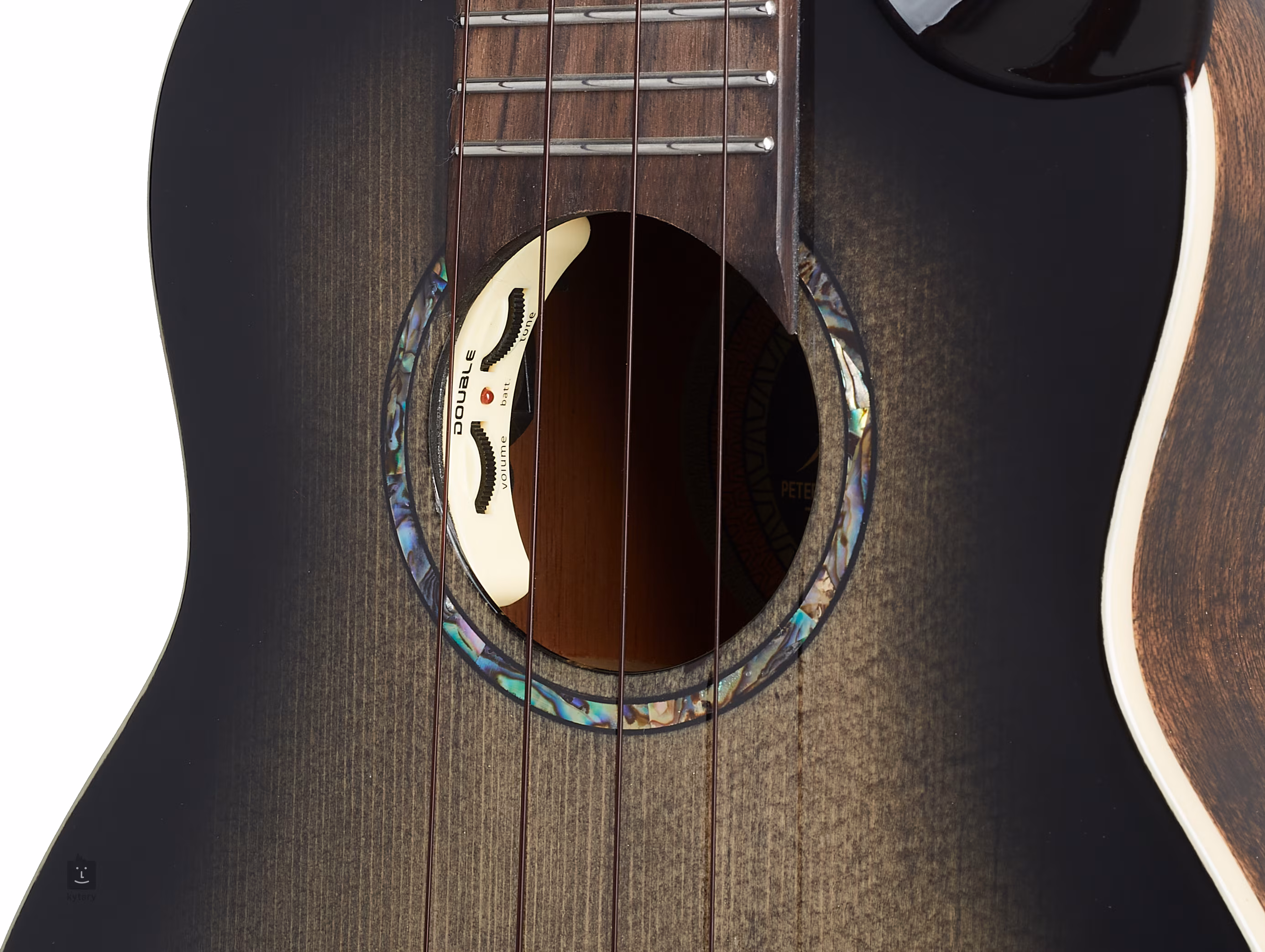 Tělo ukulele je zhotoveno z těch nejprověřenějších dřev - masivního smrku na přední desce a afrického mahagonu na zadní desce a lubech. Tělo zdobí saténový finiš Moonburst, kontrastní oboustranná lemovka a rozeta z imitace perleti.