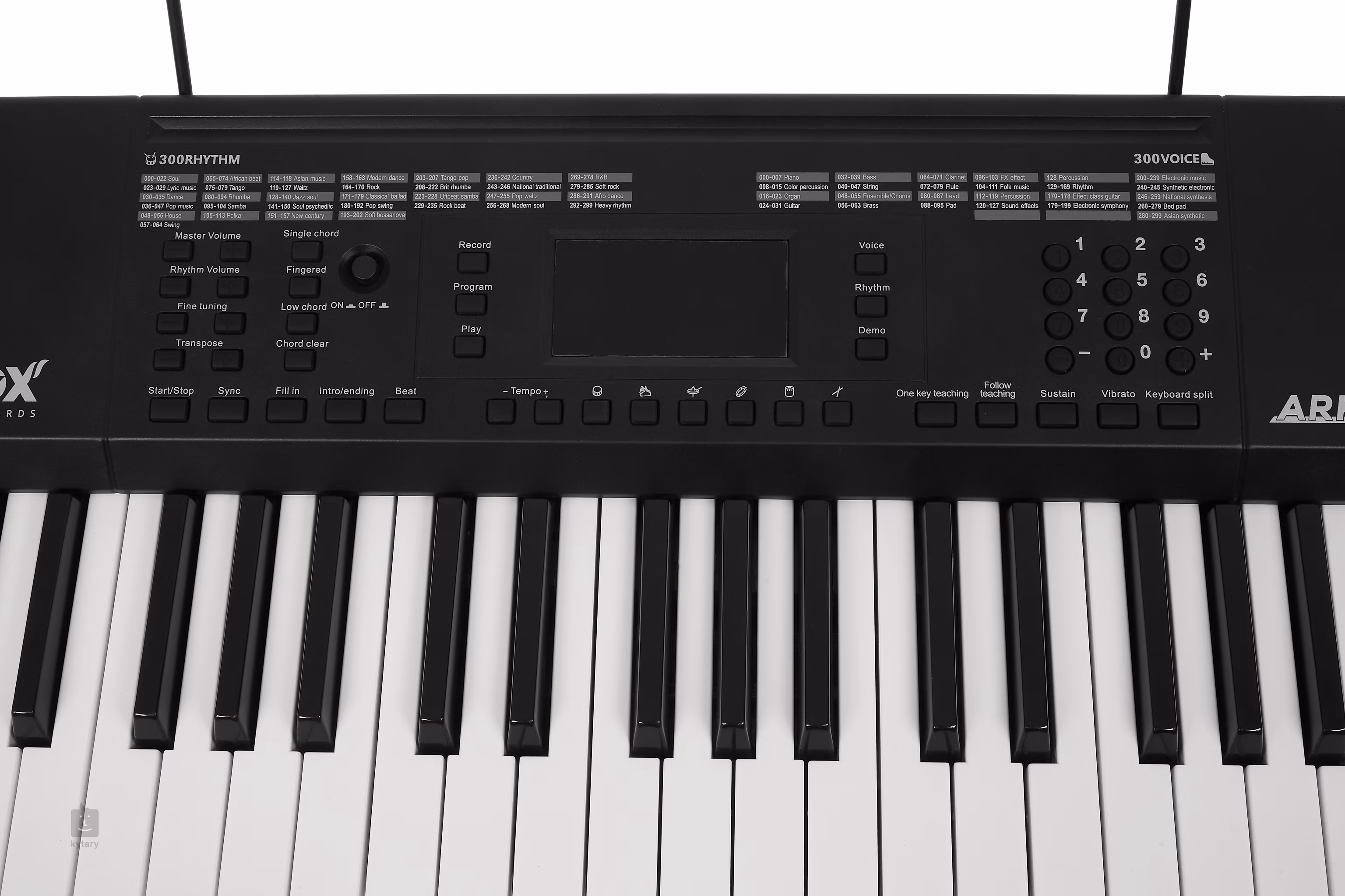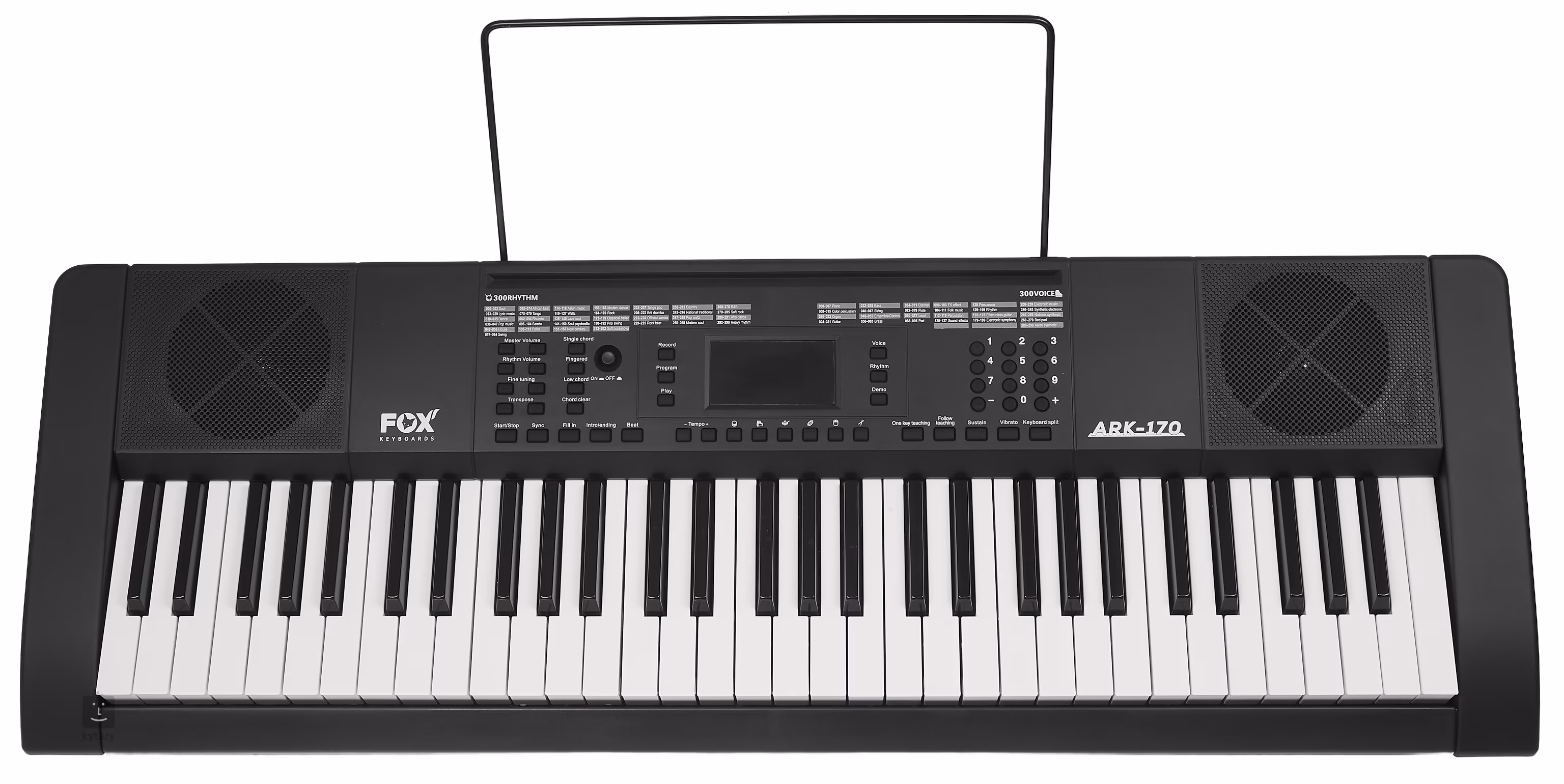 FOX K170 nabízí 61 kláves standardní velikosti bez dynamiky, šest tlačítek s perkusemi, přehledný LED displej, 300 zvuků, 300 automatických doprovodů a 50 demo songů. Nechybí ani pokročilé funkce jako Split (rozdělení klaviatury pro hru na dva nástroje zároveň), Dual Voice (vrstvení zvuků), nebo nastavení Sustainu (dozvuku) a Vibrata. Klaviaturu lze rovněž transponovat, což ocení jak začátečníci, tak pokročilí hráči. Samozřejmostí je možnost hraní akordů jedním prstem, funkce Record pro záznam vašich pokusů nebo metronom a výukový systém.