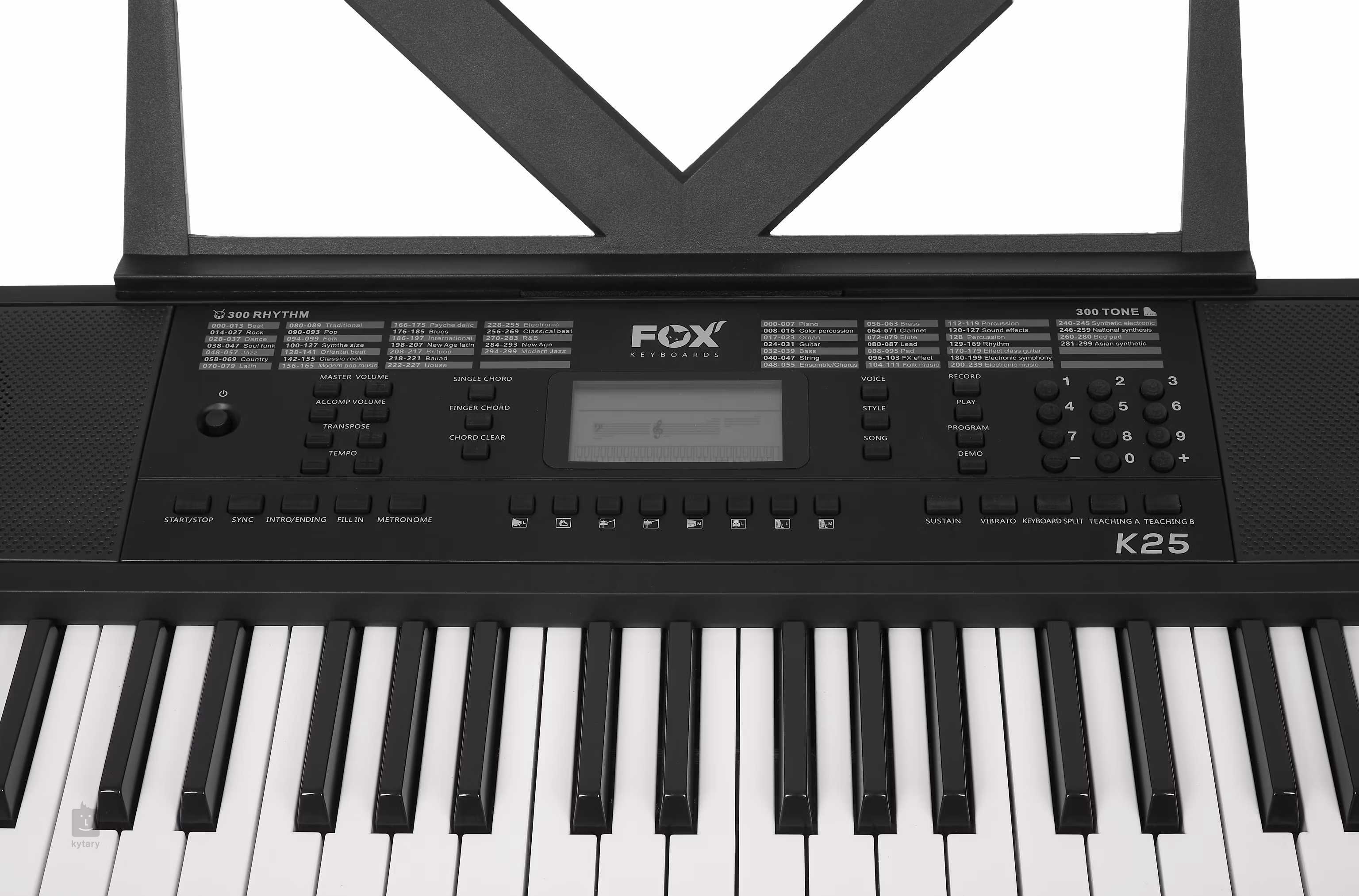 Klávesy značky FOX jsou oblíbené především pro bezkonkurenční poměr cena/výkon a jsou vhodné především pro začínající a dětské muzikanty. Těm nabídnou veškeré základní funkce, díky nimž si mohou osvojit základní hudební principy a seznámit se s různými barvami zvuku. A pokud se nakonec hudební vášeň nerozvine, nemusíte smutnit nad tím, že jste do prvního nástroje investovali nesmyslně vysokou částku. FOX K25 nabízí 54 kláves standardní velikosti s dynamikou, 300 klasických i elektronických zvuků, osm drum padů, 300 automatických doprovodů, nebo 50 demo songů. Nechybí ani pokročilé funkce jako Split (rozdělení klaviatury pro hru na dva nástroje zároveň), nebo nastavení Sustainu (dozvuku) a Vibrata. Klaviaturu lze rovněž transponovat, což ocení jak začátečníci, tak pokročilí hráči. Samozřejmostí je možnost hraní akordů jedním prstem, funkce Record pro záznam vašich pokusů nebo metronom a výukový systém. Ke klávesám je možné připojit mikrofon nebo externí zařízení s vašimi oblíbenými nahrávkami a zajamovat si tak s nimi.