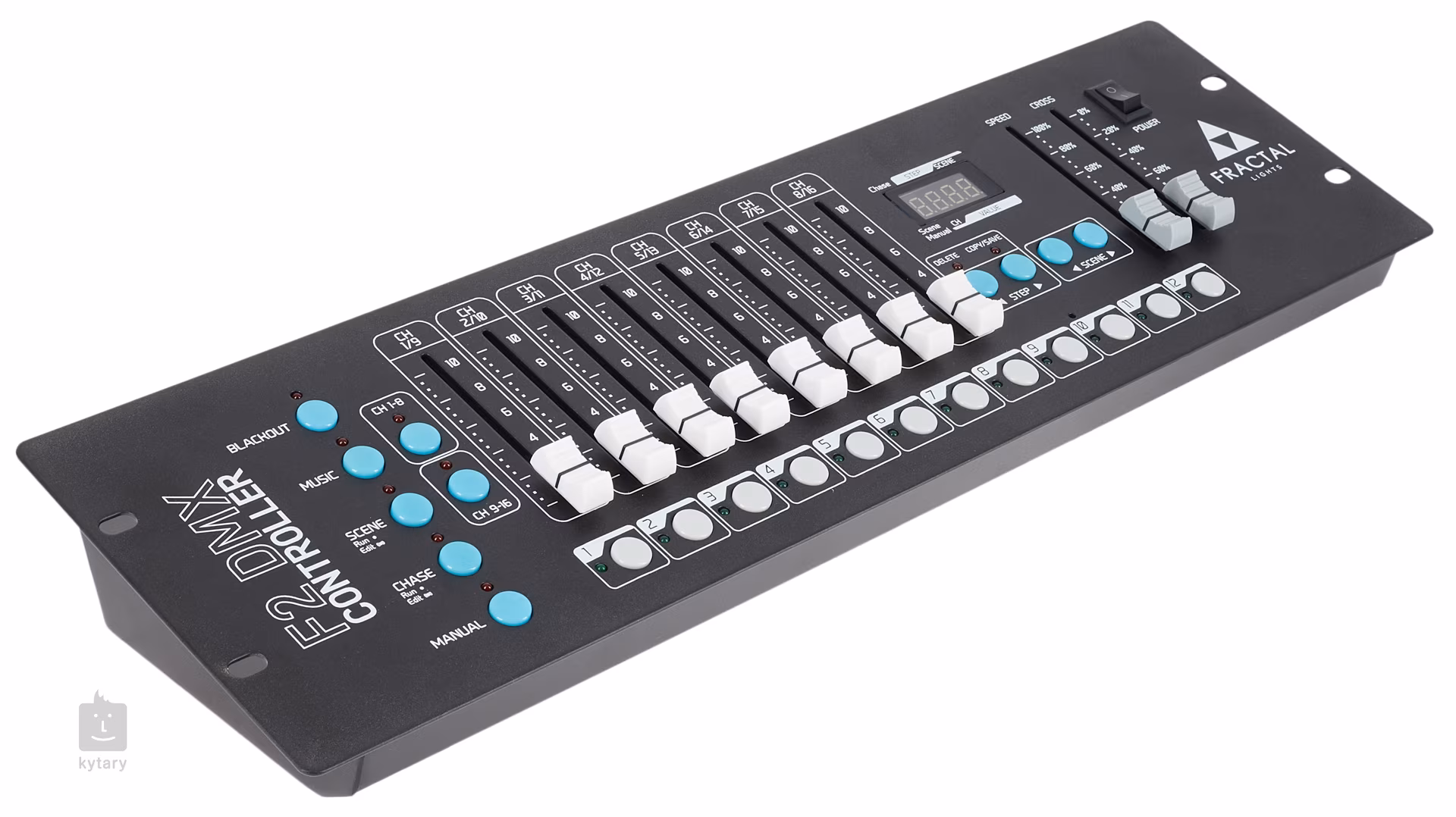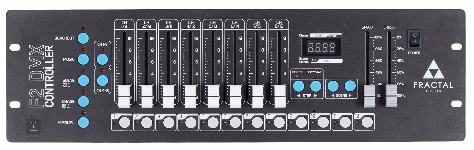 F2 DMX Control od společnosti Fractal je univerzální rackový DMX kontrolér, který vám umožní ovládat až 12 svítidel o 16 kanálech, což dohromady dává 192 dostupných kanálů. Kontrolér je kompaktní a umožňuje montáž do 19“ racku, což je ideální pro stálé instalace v hudebních klubech, filmových studiích, DJ setupech a mnoha dalších prostorách. Ovládací panel kontroleru je velmi intuitivní – obsahuje 12 tlačítek pro přepínání připojených světel, 8 táhel pro ovládání šestnácti kanálů a přehledný displej pro snadnou navigaci scén a sekvencí (chases). Dále jsou k dispozici dedikovaná táhla pro rychlost a prolínání programů (Speed a Cross) a sada tlačítek pro ovládání funkcí jako je blackout, zvuková synchronizace, automatické přehrávání scén nebo sekvencí a manuální nastavení.