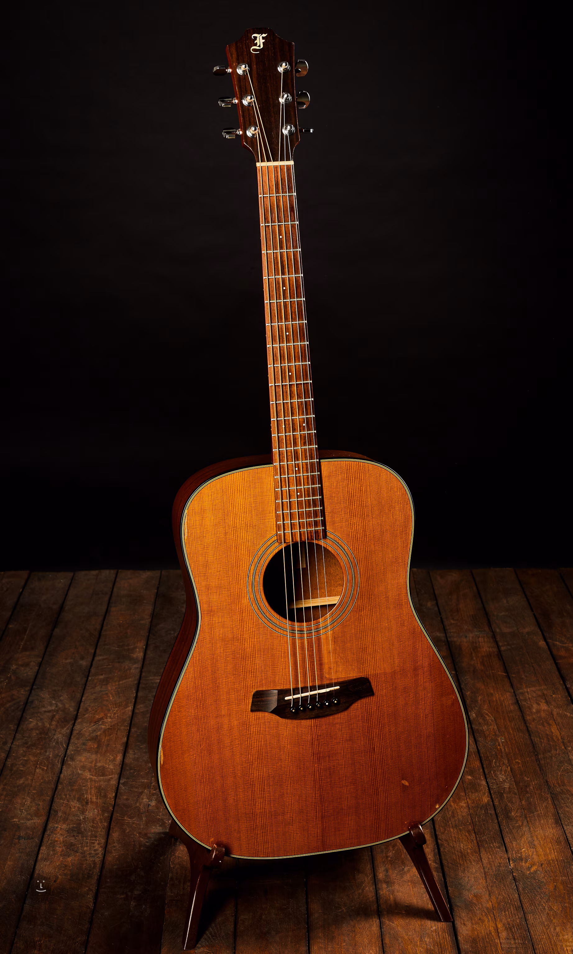 Polomasivní dreadnought Furch s masivní cedrovou přední deskou a vrstvenými mahagonovými luby a zadní stranou. Nástroj byl vyrobený v České republice v roce 2002.