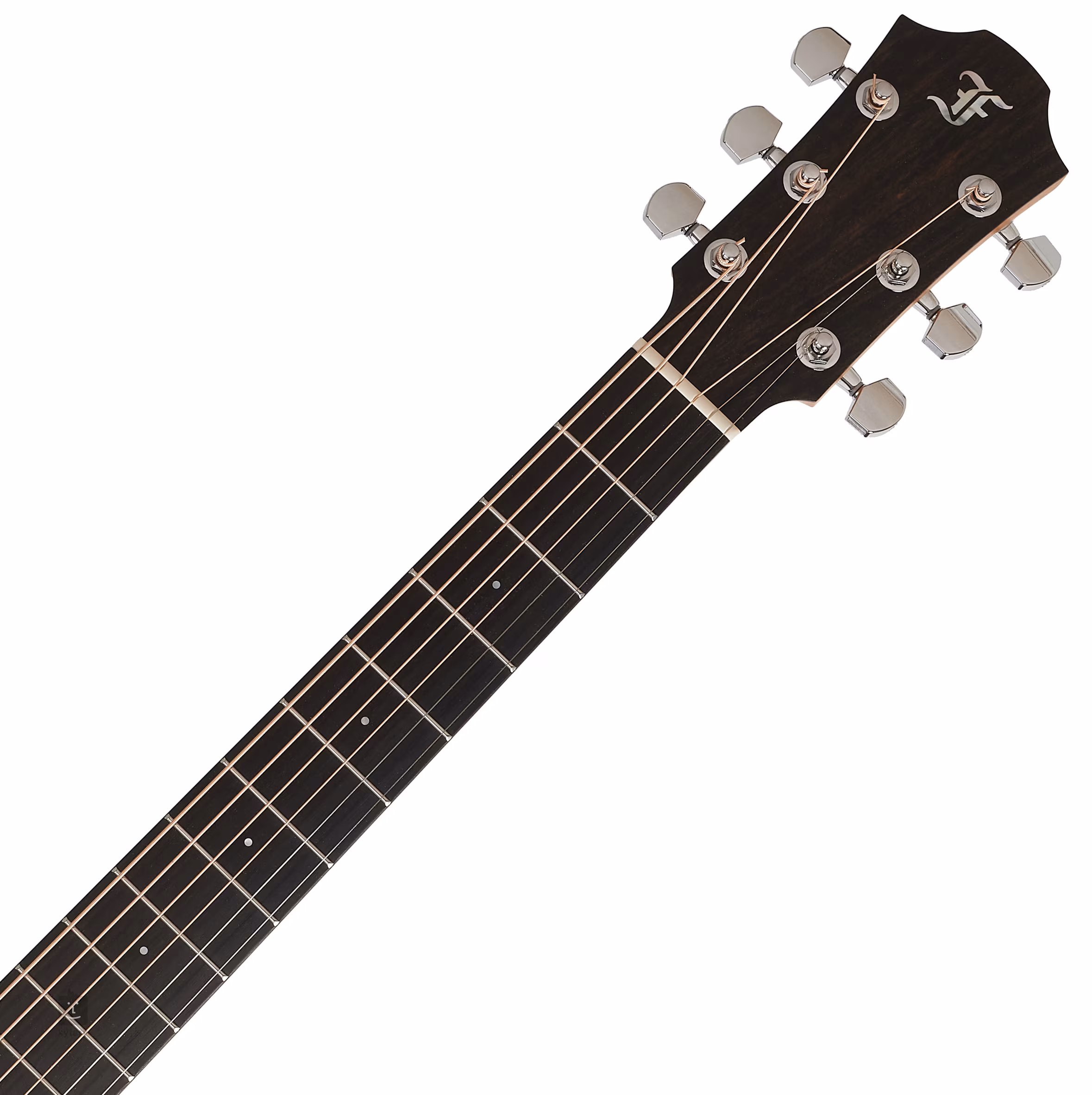 Orientaci na ebenovém hmatníku usnadňují boční a čelní bodové poziční značky z bílé perleti. Saténová úprava krku Full-Pore Smooth-Slide Satin Finish optimalizuje hratelnost a umožňuje klouzat plynule z akordu do akordu. Chromované firemní mechaniky s převodovým poměrem 1:18 jsou zárukou přesného a stabilního ladění. Luxusní vzhled kytar Furch Green podtrhuje lemovka z imitace slonoviny s výložkou z pěti vrstev černobílých kontrastních linek a rozeta tvořená dvojitým prstencem s vykládáním z černého ořechu.