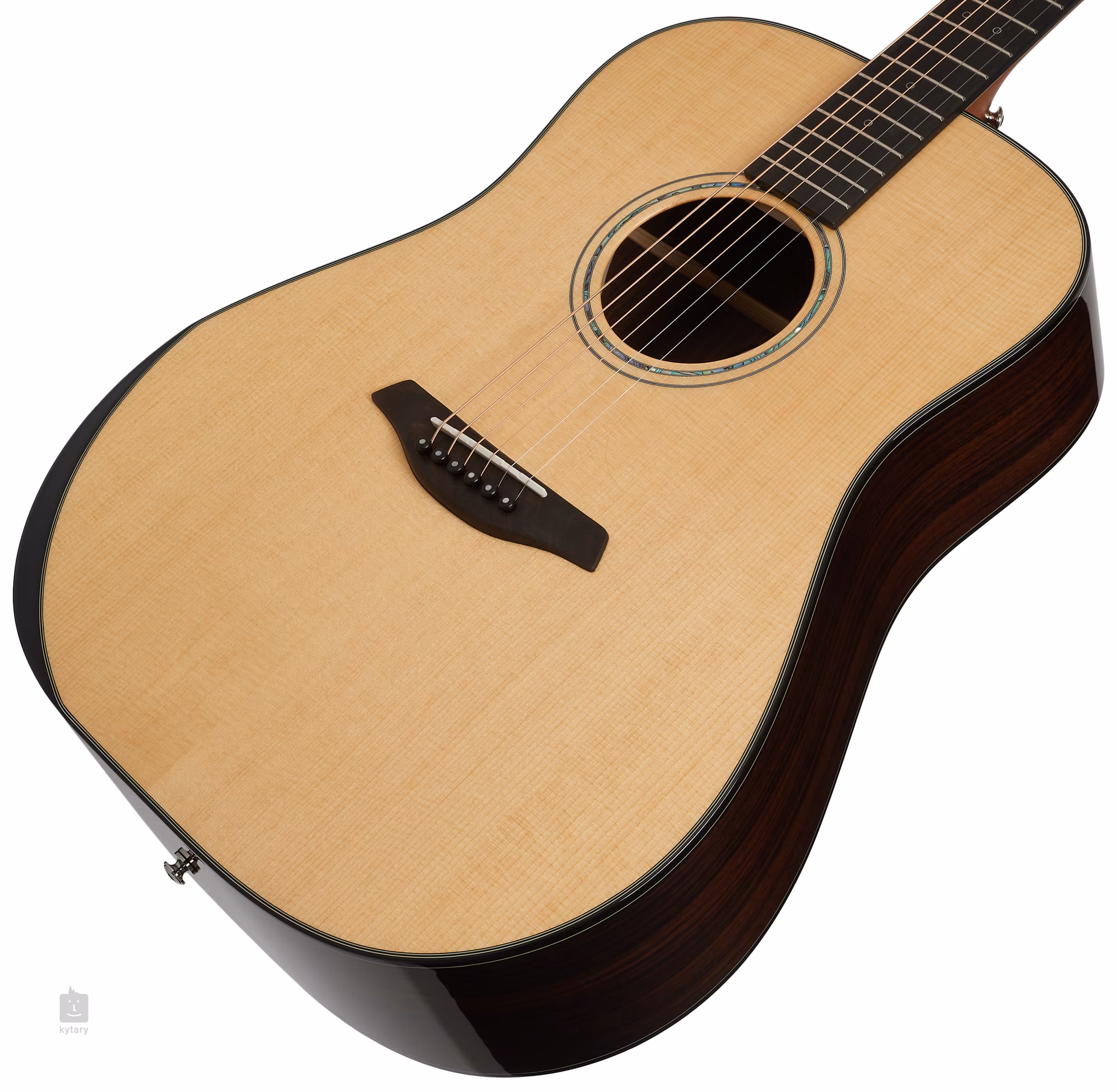 Atraktivní vzhled kytary podtrhuje řada detailů v podobě rozety tvořené dvojitým prstencem s vykládáním ze zeleného abalone, výložky z pěti vrstev černobílých kontrastních linek a perleťových bočních lineárních a čelních kruhových polohových značek. Transparentní pickguard nechává vyniknout přirozené kresbě dřeva a zároveň neovlivňuje rezonanci přední desky. Stabilní ladění zaručují špičkové mechaniky Gotoh 510 ve stříbrné patině s ebenovými kolíčky a jemným převodem 1:21.