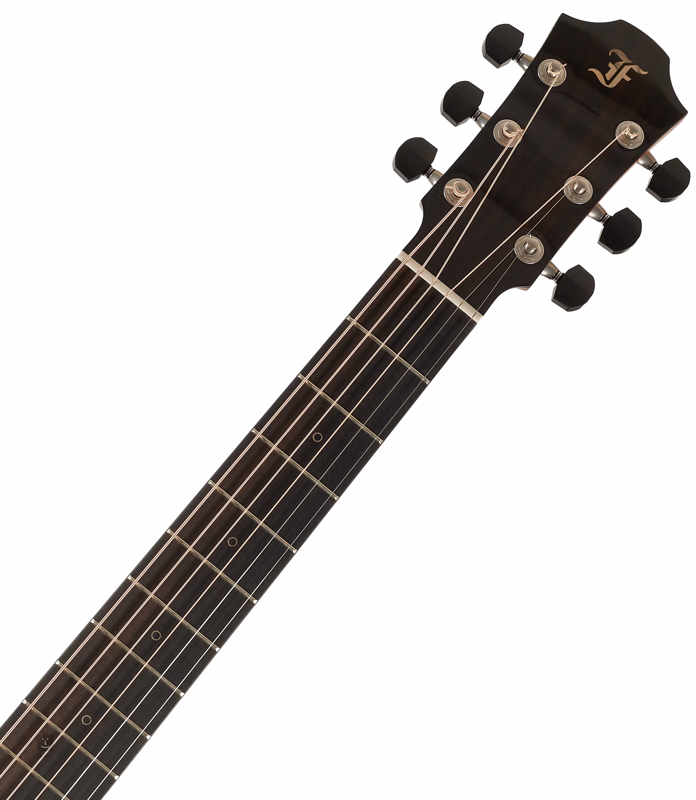Dvoucestná výztuha krku Furch CNR System zvyšuje pevnost, stabilitu i odolnost krku. Orientaci na ebenovém hmatníku (šířka nultého pražce je 48 mm) usnadňují boční perleťové poziční značky a čelní perleťové kroužky Eclipse. Špičkové mechaniky Gotoh 510 ve stříbrné patině s ebenovými kolíčky a jemným převodem 1:21 jsou zárukou stabilního ladění. Transparentní pickguard nechává vyniknout přirozené kresbě dřeva a zároveň neovlivňuje rezonanci přední desky. Pěkné zpracování kytar Furch Yellow podtrhuje lemovka z imitace želvoviny s výložkou z pěti vrstev černobílých kontrastních linek a rozeta tvořená dvojitým perleťovým prstencem.