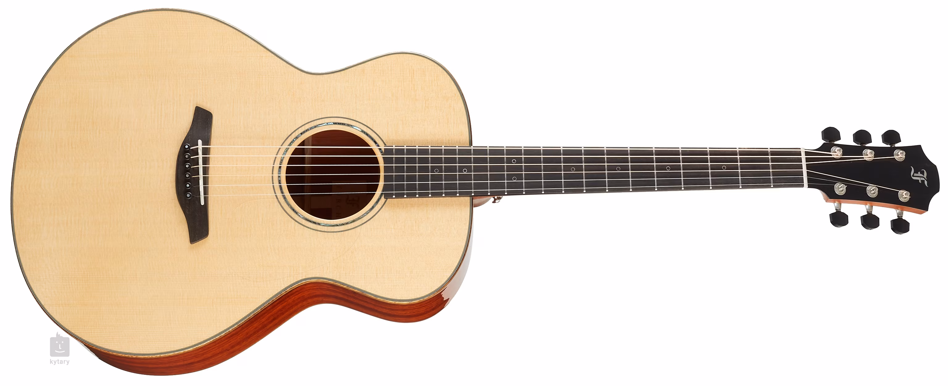 Orientaci na ebenovém hmatníku usnadňují elegantní čelní kruhové poziční značky s tenkou obrysovou linkou z bílé perleti a boční perleťové bodové značky. Transparentní pickguard nechává vyniknout přirozené kresbě dřeva a zároveň neovlivňuje rezonanci přední desky. Stabilní ladění zaručují špičkové mechaniky Gotoh 510 ve stříbrné patině s leštěnými ebenovými kolíčky a vysoce jemným převodovým poměrem 1:21.