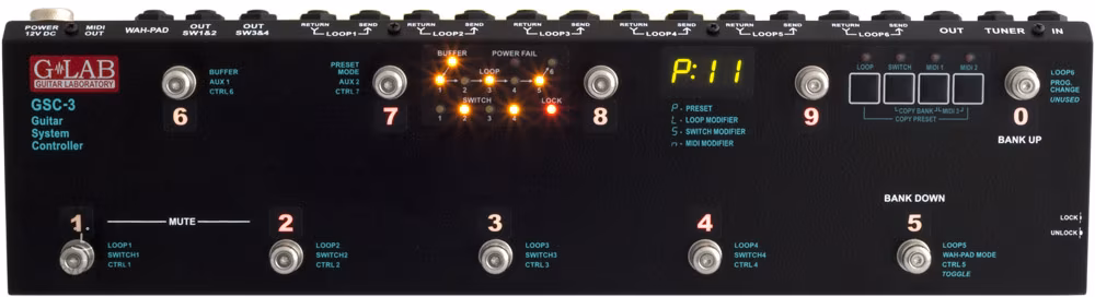 GSC představuje velmi vyspělý kontrolní systém, který Vám umožní výrazně zjednodušit ovládání celé Vaší výbavy a tím i zpříjemní hraní a umožní se soustředit jen a jen na hudbu. Díky GSC můžete stisknutím jediného tlačítka můžete zapnout vybrané efekty, měnit hlasitost, přepínat kanály či jiné funkce aparátu a měnit pomocí MIDI nastavení například efektových procesorů. Už nikdy více ono známé „tančení po efektech“… V současnosti jsou v nabídce G-Lab tři verze GSC – základní model GSC a verze GSC 2 a GSC 3, které jsou totožné a pouze se liší použitím různých typů spínačů – podsvícených u GSC 2 a kovových u GSC 3. Kontroler je samozřejmě vybaven true-bypass spínači.