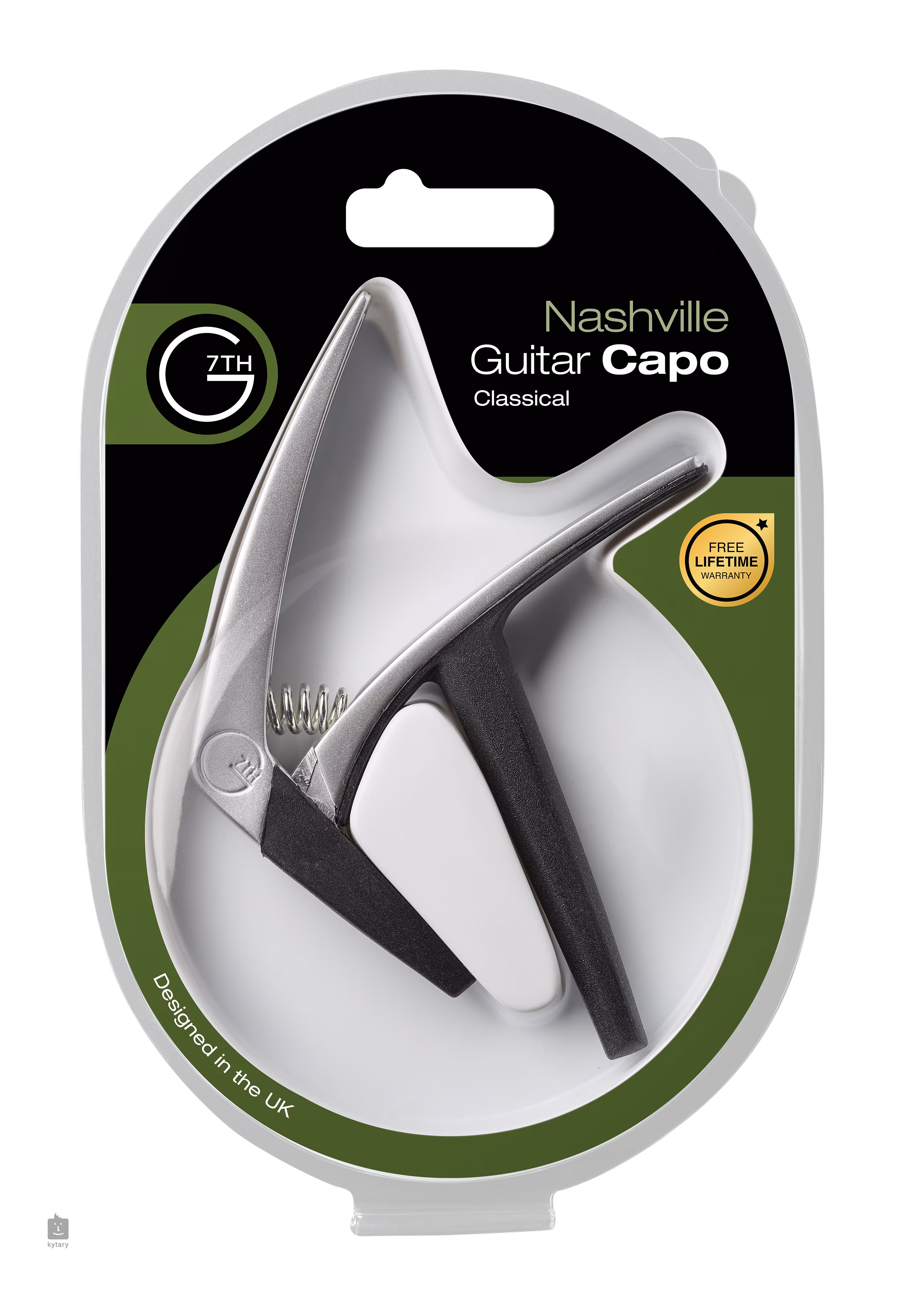 Nashville od firmy G7th je praktický lehký kapodastr opatřený pružinovým mechanismem pro snadné upnutí/uvolnění na krk kytary. Přenáší napětí rovnoměrně napříč strunami, které tak drží ladění. Části přicházející do styku s krkem kytary jsou opatřeny silikonovou pogumovanou vložkou a zabraňují tak poškození.