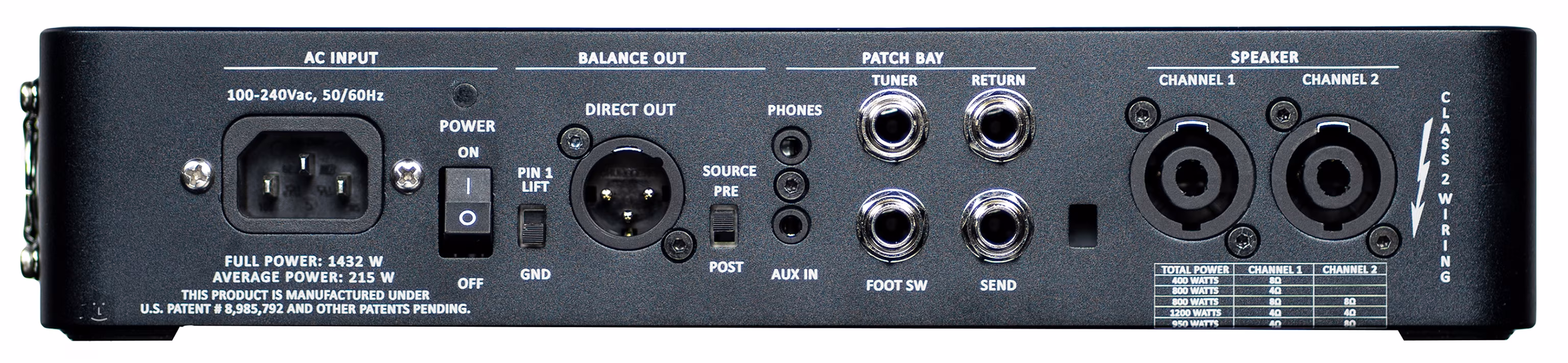Legacy 1200 spolu se zesilovačem třídy D nabízí maximální výkon až 1200W. Přední ovládácí panel je tvořen ovladačem hlasitosti a zkreslení, přepínačem Overdrive či čtyřpásmovým ekvalizérem pro úpravu zvukového signálu. Dále zde naleznete spínače zvukových filtrů Bump/Contour/Presence pro co nejflexibilnější využití zesilovače. Zadní panel potom nabízí třípolohový přepínač impedance, dvoupolohový přepínač Pre/Post zdroje, Speakon konektory pro připojení reproboxů, efektovou smyčku, vstup pro footswitch a ladičku, nebo výstup pro sluchátka či vstup pro hudební zařízení. Samozřejmostí je XLR výstup pro DI Box s přepínačem odzemnění Lift/Ground. Zesilovač disponuje dvěma robustními madly pro pohodlný transport a snadnou manipulaci na pódiu.