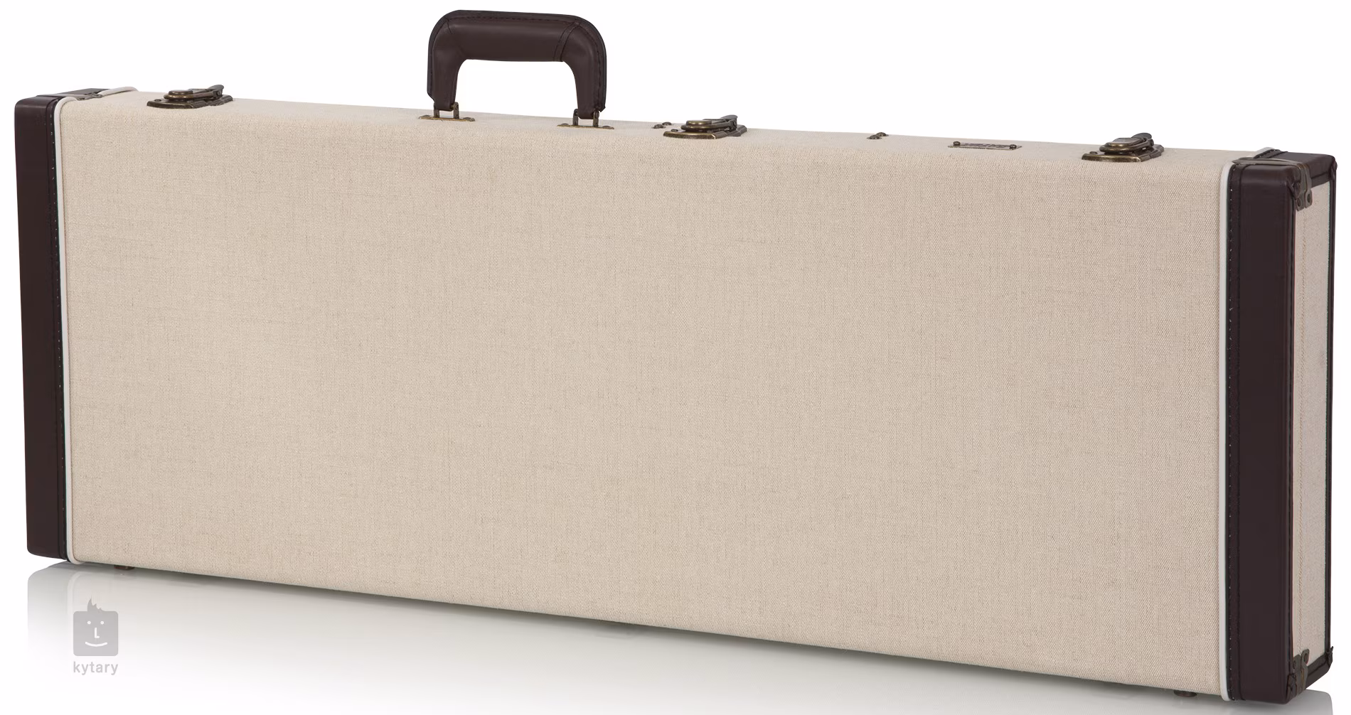 Konstrukce je vyrobena z robustních překližkových panelů a pečlivě sestavená tradičním způsobem, díky čemuž vytváří mimořádně spolehlivou ochranu. Vnější povrch tvoří hrubá jutová tkanina v kombinaci s elegantním hnědým lemováním v barvě espressa, což dodává kufru výrazný vintage vzhled. O autentický retro dojem se stará také mosazné kování s umělou patinou a mosazná uzamykatelná přezka, která zamezuje nechtěnému otevření kufru nebo krádeži nástroje.