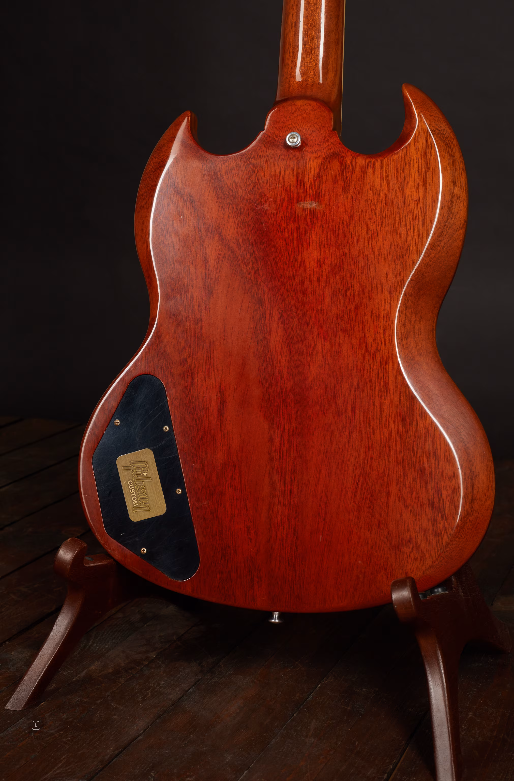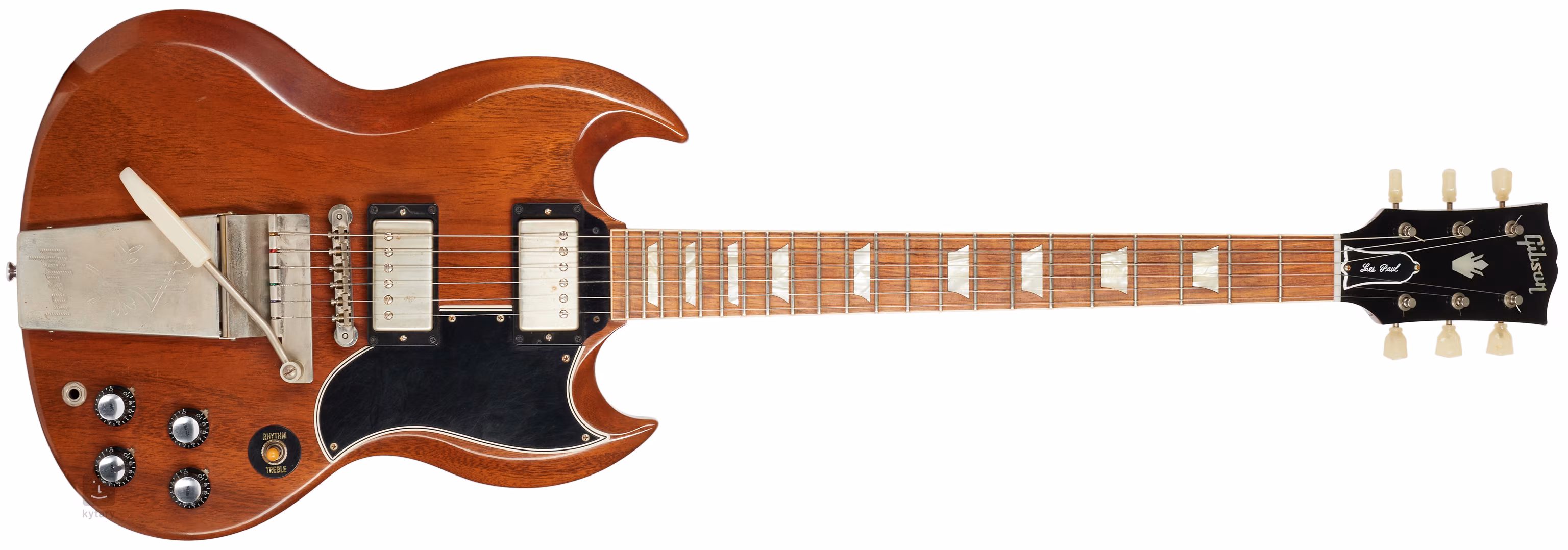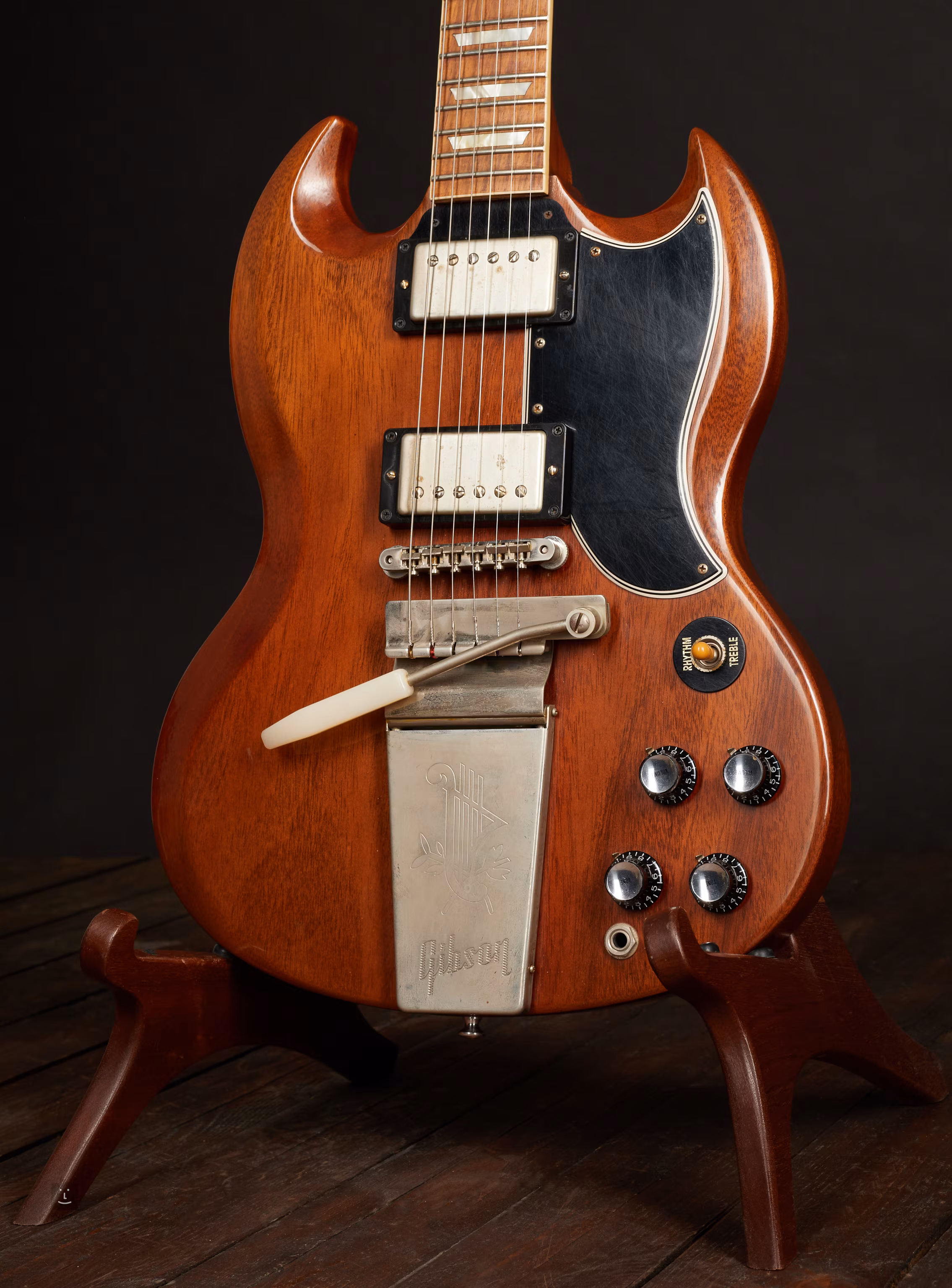 1964 SG Standard Reissue w/ Maestro Vibrola VOS Cherry Red je historicky autentický „reissue“ model z dílen Gibson Custom Shopu, který se vrací k designu z roku 1964. Tělo vyřezané z jednoho kusu mahagonu zdobí barevná úprava Cherry Red. Speciální finiš VOS (Vintage Original Specs) poskytuje kytaře autentický vzhled a feel originálů.