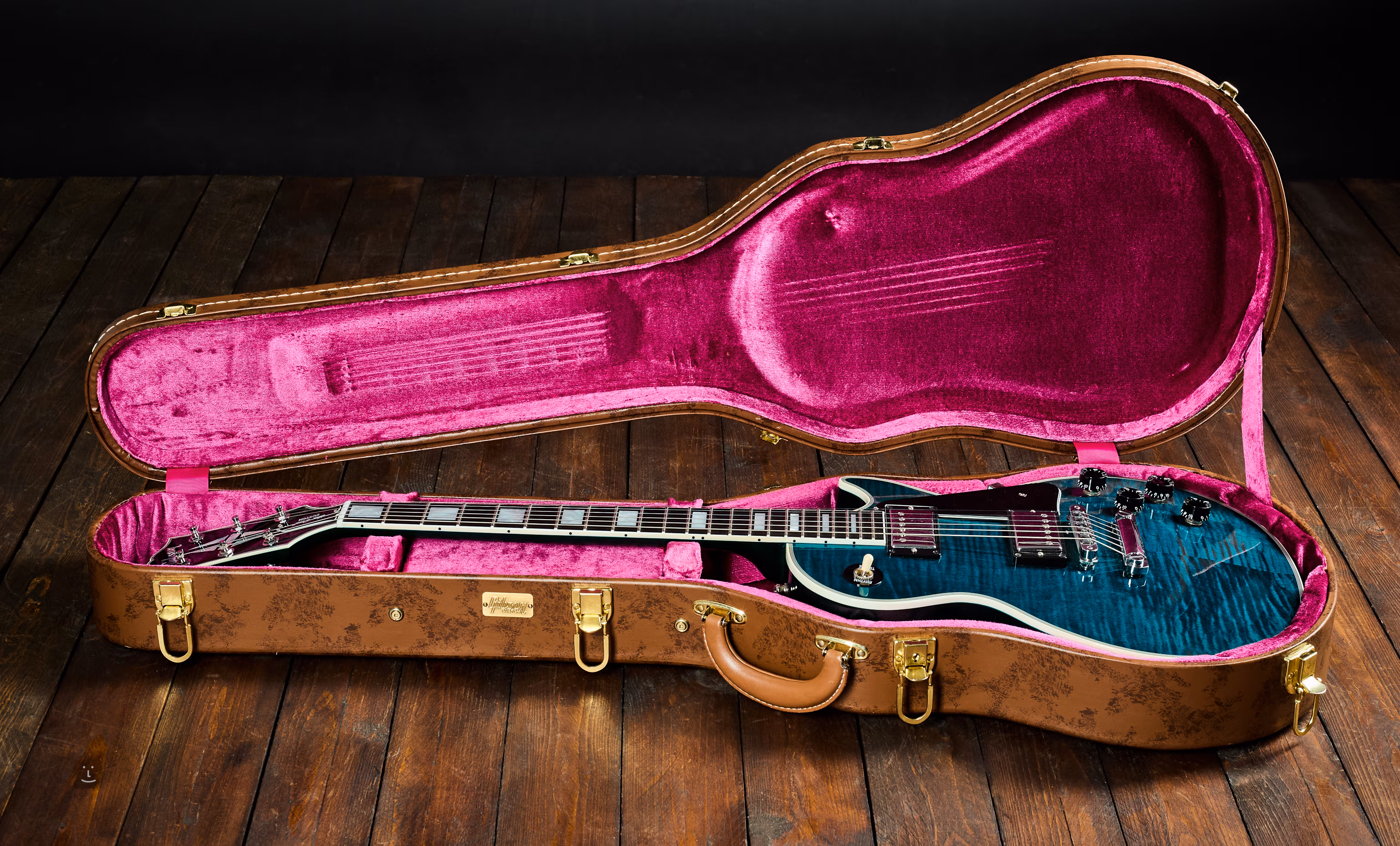 Zakázkový Les Paul Figured vyrobený v Custom Shoupu Gibson v roce 2017 jako "Pre-Sold Limited" kousek z dílny Gibson Custom Shop, tedy na objednávku přímo z továrny, ve velmi malém počtu. Modrá transparentní barva dává vyniknout fládrování výběrového javoru na přední desce, přitom na bocích a zadní straně chytá na mahagonovém podkladu zelenavý nádech. Velmi raritní exemplář.
