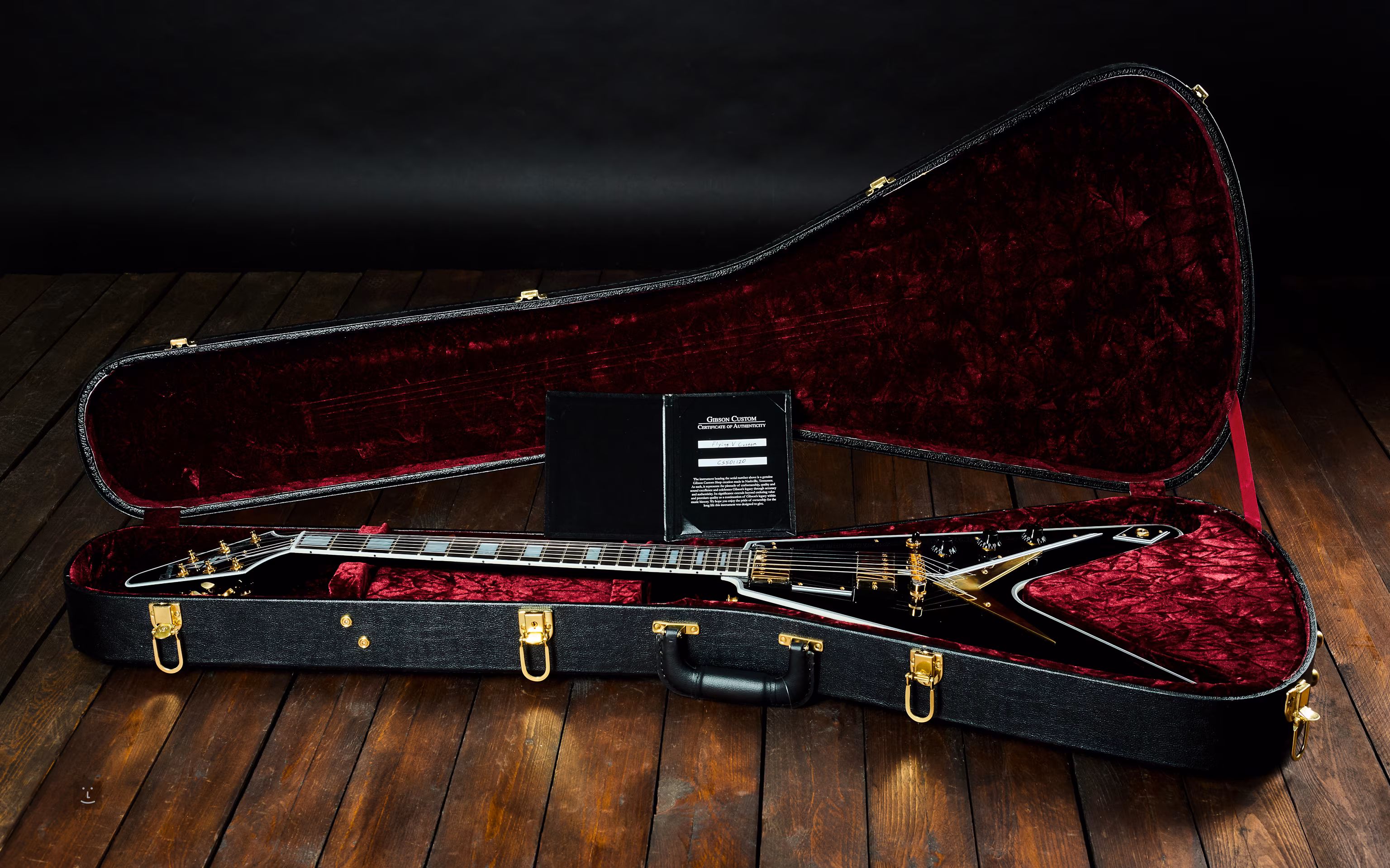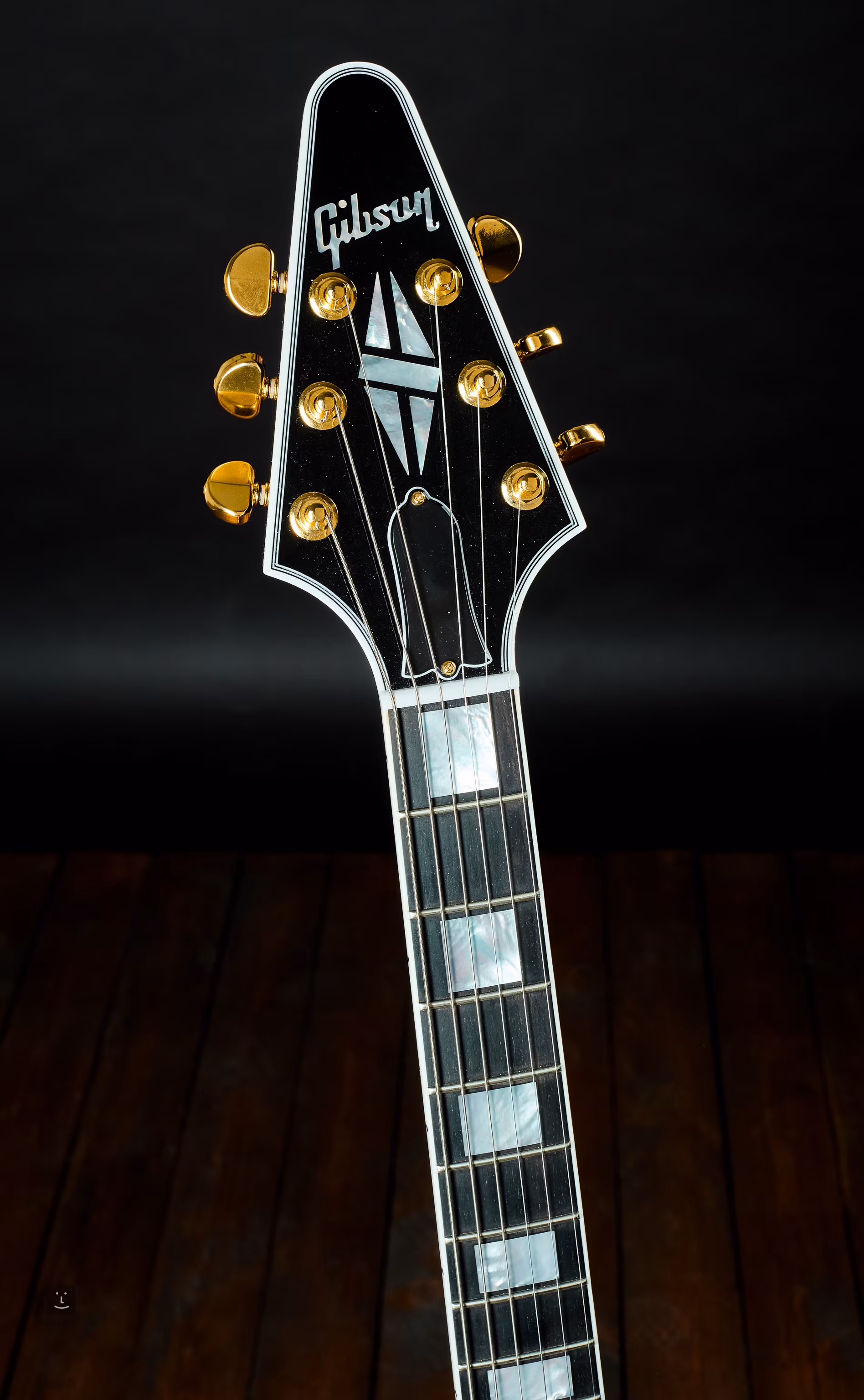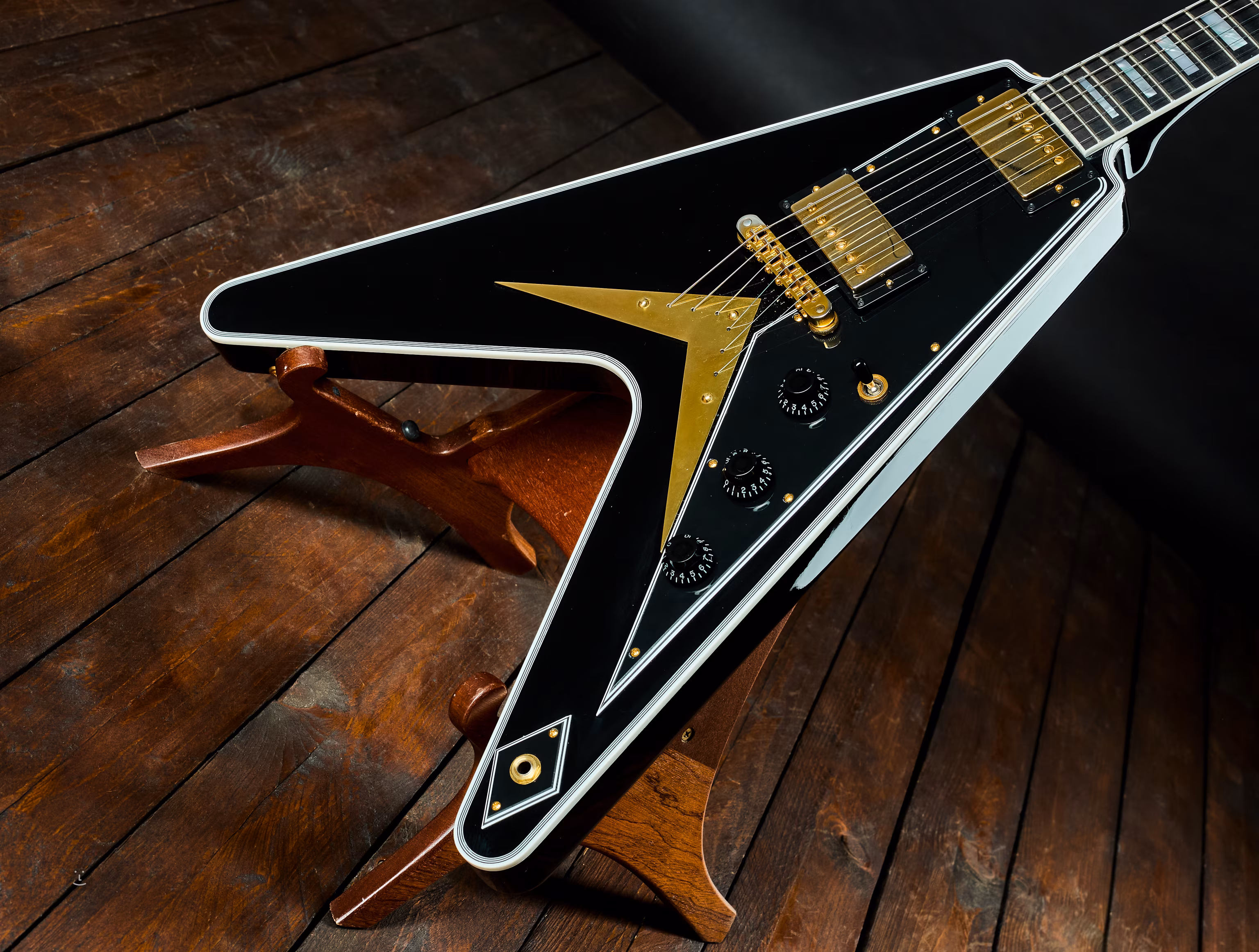 Dechberoucí, nadčasový design Flying V představila značka Gibson už v roce 1958. Tělo vyřezané z jednoho kusu mahagonu zdobí černočerná barevná úprava, které dává vyniknout lesklý lak typu nitro. K mahagonovému krku je přilepený ebenový hmatník, který je osazený 22 pražci medium-jumbo. Obdélníkové poziční značky jsou z perleti (mother of pearl). Lemování je kolem těla, hmatníku i hlavice. Luxusní vzhled podtrhuje hardware v kontrastní zlaté barvě a černý čtyřvrstvý pickguard.
