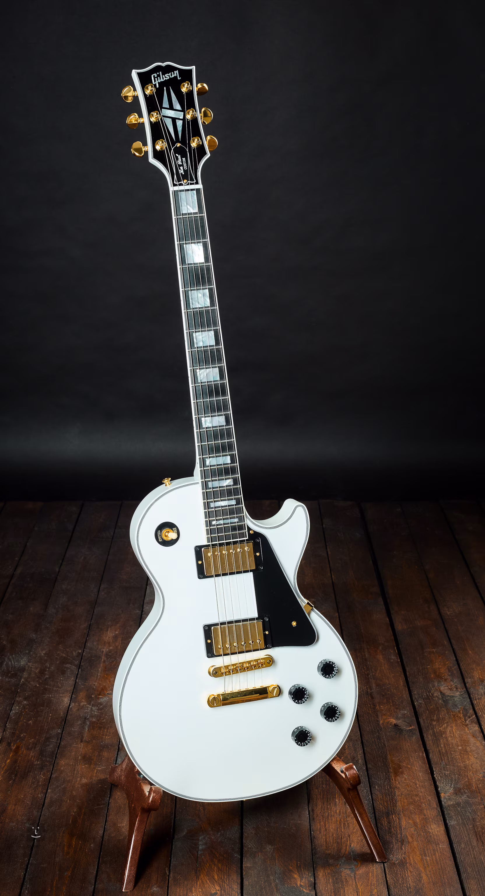 Les Paul Gibson Custom ve sněhově bílé barvě Alpine White. Vynikající, téměř nový nástroj z roku 2025.