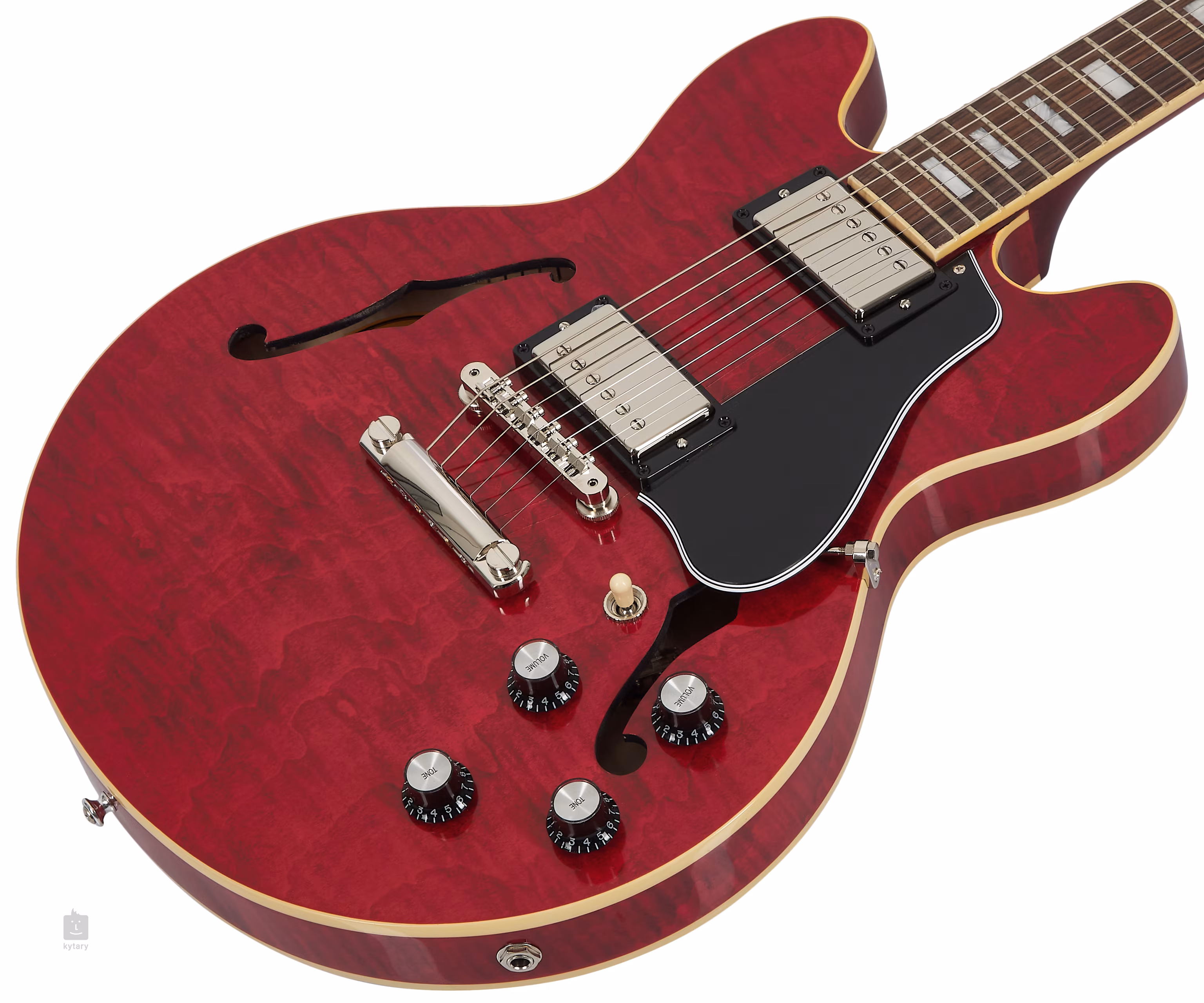 Tělo modelu ES-339 Figured Sixties Cherry je zhotoveno z vrstveného javoru a topolu. Luxusní kresbu vnější dýhy z figurovaného javoru kvality AAA zvýrazňuje lesklý lak z nitrocelulózy a barevná úprava Sixties Cherry. Středový blok z masivu javoru vyztužuje přední desku, zlepšuje sustain nástroje a odolnost proti nežádoucímu “vazbení”.