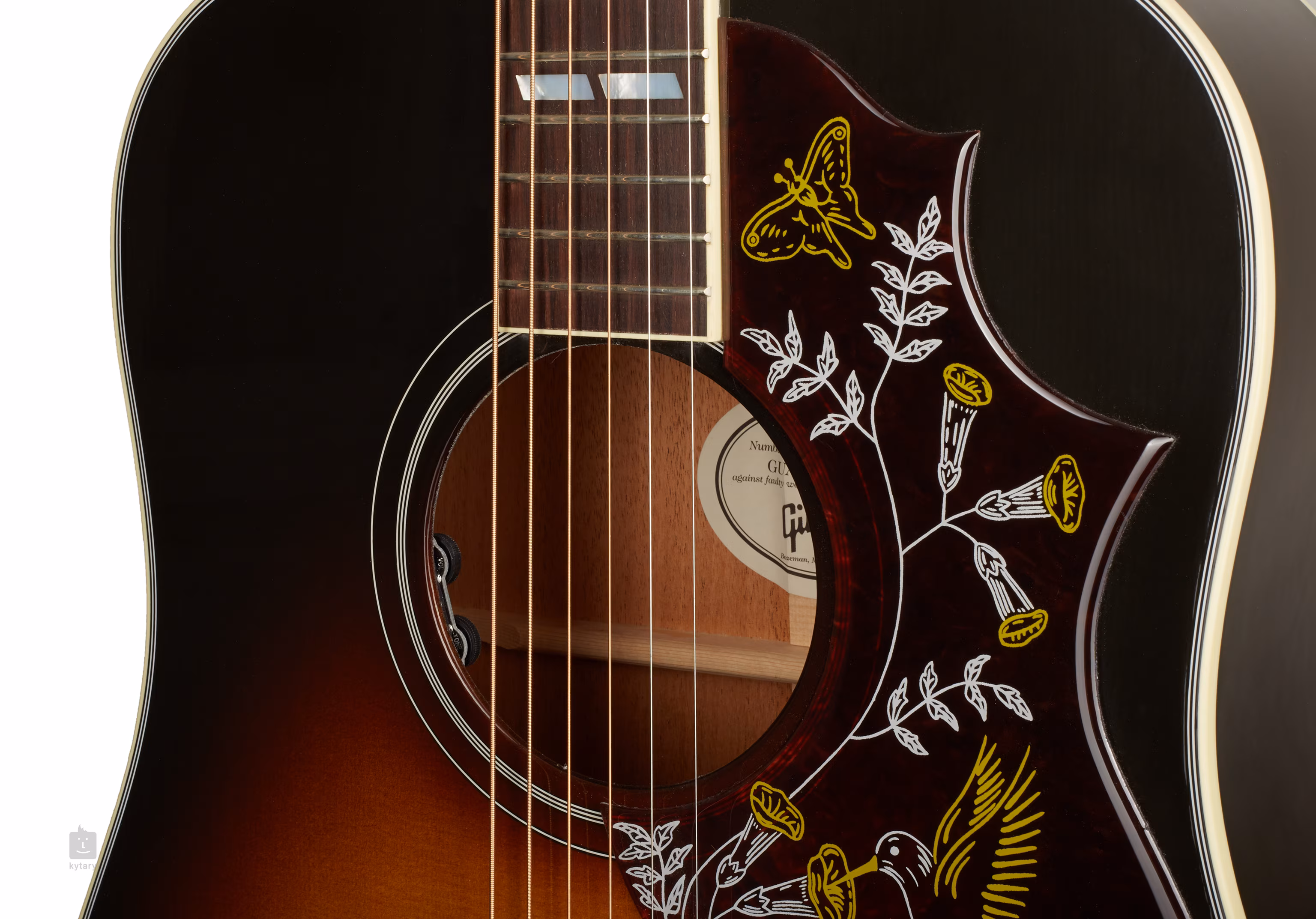 Tento současný model Gibson Hummingbird už na první pohled upoutá designem s barevnou úpravou Vintage Sunburst v kombinaci s pickguardem zkrášleným zdobnými motivy včetně charakteristického vyobrazení kolibříka (hummingbird). V rámci stavby těla zůstala kytara naprosto věrná tradici prvních modelů; přední deska je zhotovena z masivního smrku Sitka, zadní deska a luby z masivního mahagonu. Dobré rezonanční vlastnosti kytary podporuje snížené žebrování Scalloped X.