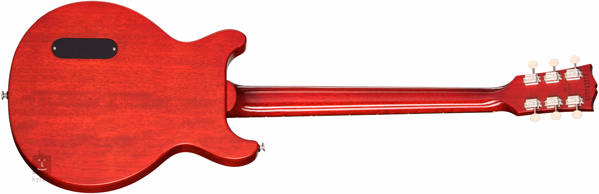Tělo elektrické kytary Gibson Les Paul Junior Double Cutaway Vintage Cherry v double-cut designu je zhotoveno z mahagonu. Tenká vrstva laku z nitrocelulózy umožňuje dřevu kytary dýchat a zlepšuje zvukové kvality nástroje. K mahagonovému krku s pohodlným užším Slim Taper profilem je přilepen palisandrový hmatník osazený dvaadvaceti pražci velikosti Medium Jumbo. Orientaci na hmatníku usnadňují poziční tečky z imitace perleti.