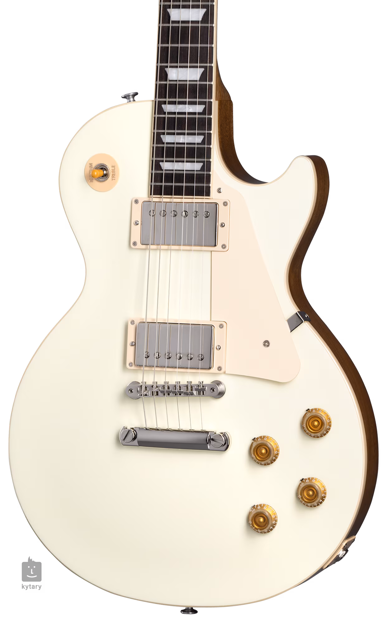 Kytara Les Paul Standard 50s Plain Top Classic White Top nabízí mahagonové tělo a javorový top, který zdobí lesklý lak a barevná úprava Classic White. K mahagonovému krku se zakulaceným profilem Vintage 50s je přilepen hmatník z indického palisandru osazený dvaadvaceti pražci velikosti Medium Jumbo. Orientaci po jeho ploše usnadňují polohové bloky z imitace perleti (Acrylic Trapezoid).