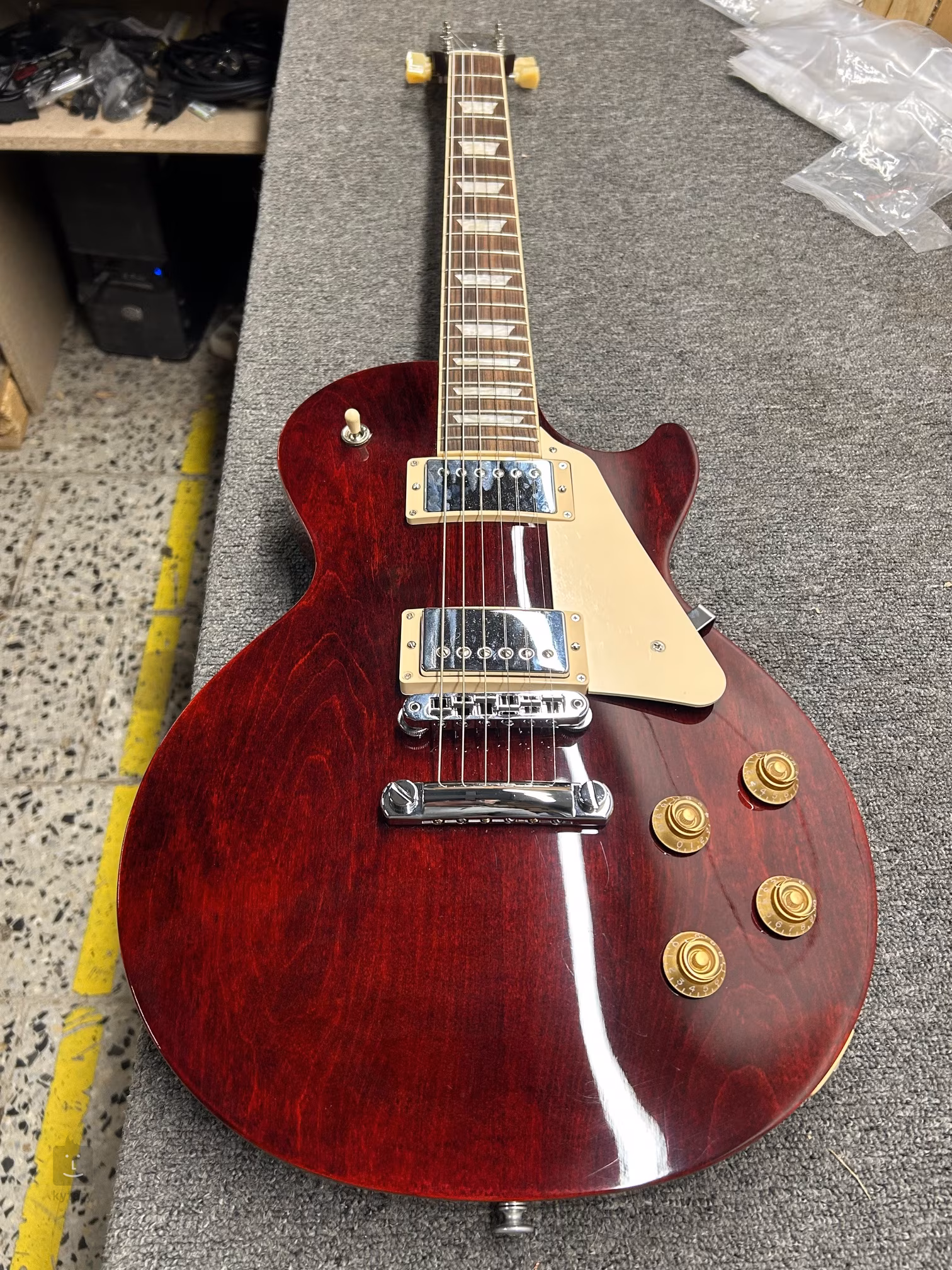 Mahagonové tělo kytary Les Paul Studio Wine Red kryje vyřezaný javorový top. Díky rezonančním komorám těla (úpravě Ultra Modern Weight Relief) je nástroj podstatně lehčí než klasické LP modely, přitom si uchovává typický Les Paul zvuk a feel. Tenká povrchová úprava v podobě laku z nitrocelulózy umožňuje dřevu kytary dýchat a zlepšuje zvukové kvality nástroje.