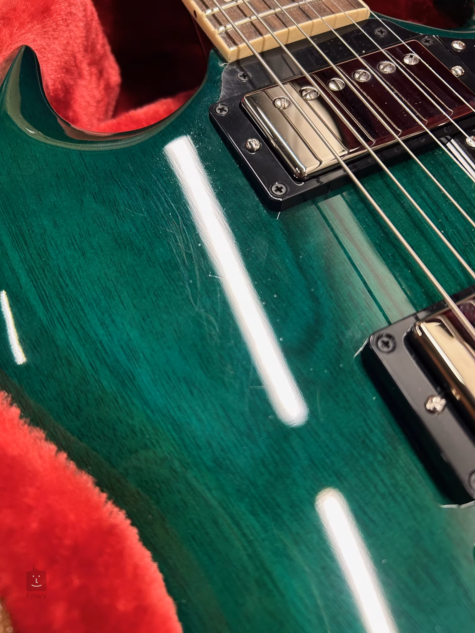 Mahagonové tělo kytary SG Standard '61 Stop Bar Translucent Teal zdobí barevná úprava Translucent Teal a tenká povrchová úprava v podobě laku z nitrocelulózy. K mahagonovému krku s profilem “SlimTaper” je přilepen palisandrový hmatník osazený dvaadvaceti pražci velikosti Medium Jumbo. Orientaci na hmatníku usnadňují polohové bloky z imitace perleti (Acrylic Trapezoid).