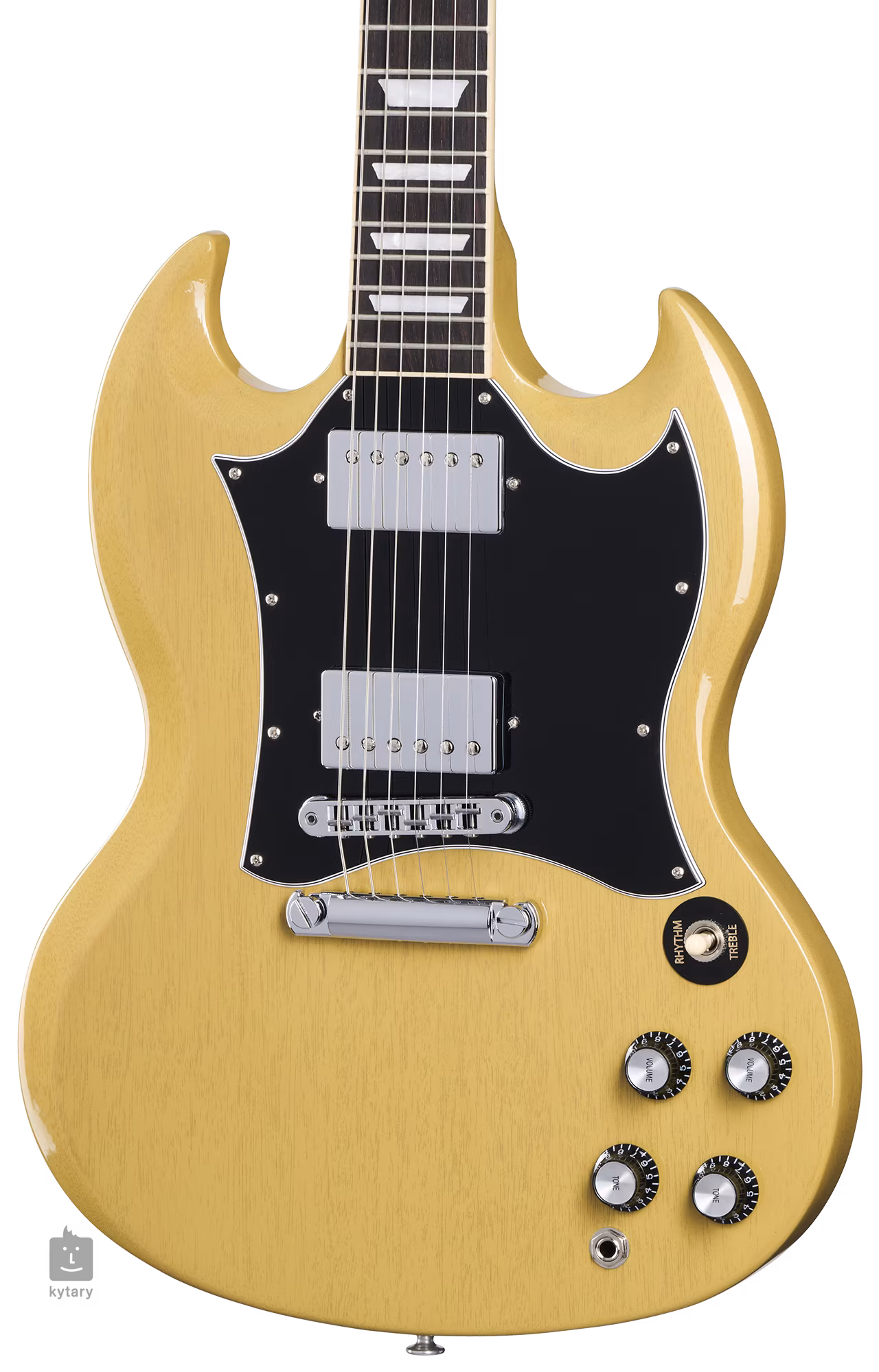 Mahagonové tělo kytary SG Standard TV Yellow zdobí barevná úprava TV Yellow a tenká povrchová úprava v podobě laku z nitrocelulózy. K mahagonovému krku je přilepen palisandrový hmatník osazený dvaadvaceti pražci velikosti Medium Jumbo. Orientaci na hmatníku usnadňují polohové bloky z imitace perleti (Acrylic Trapezoid).